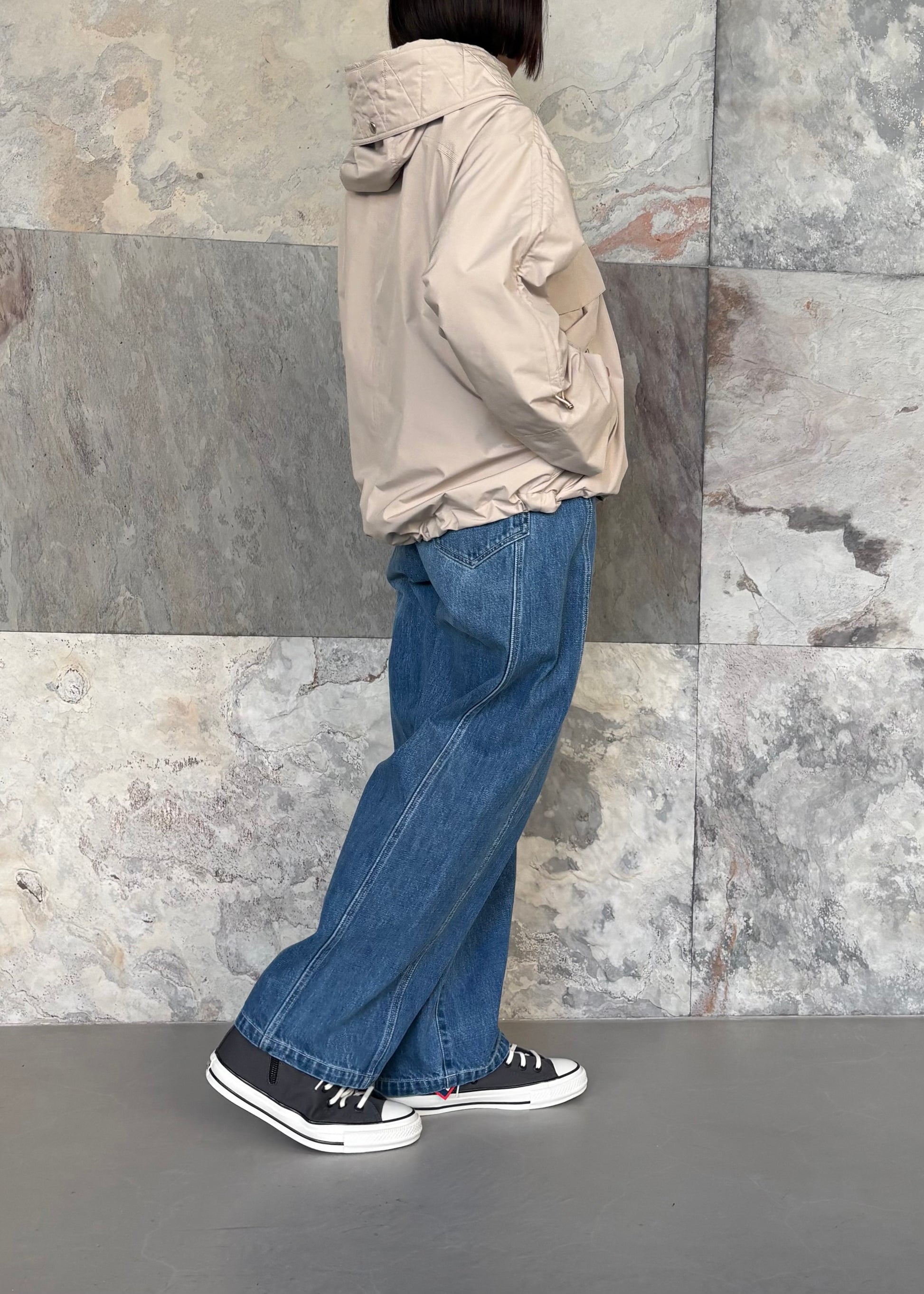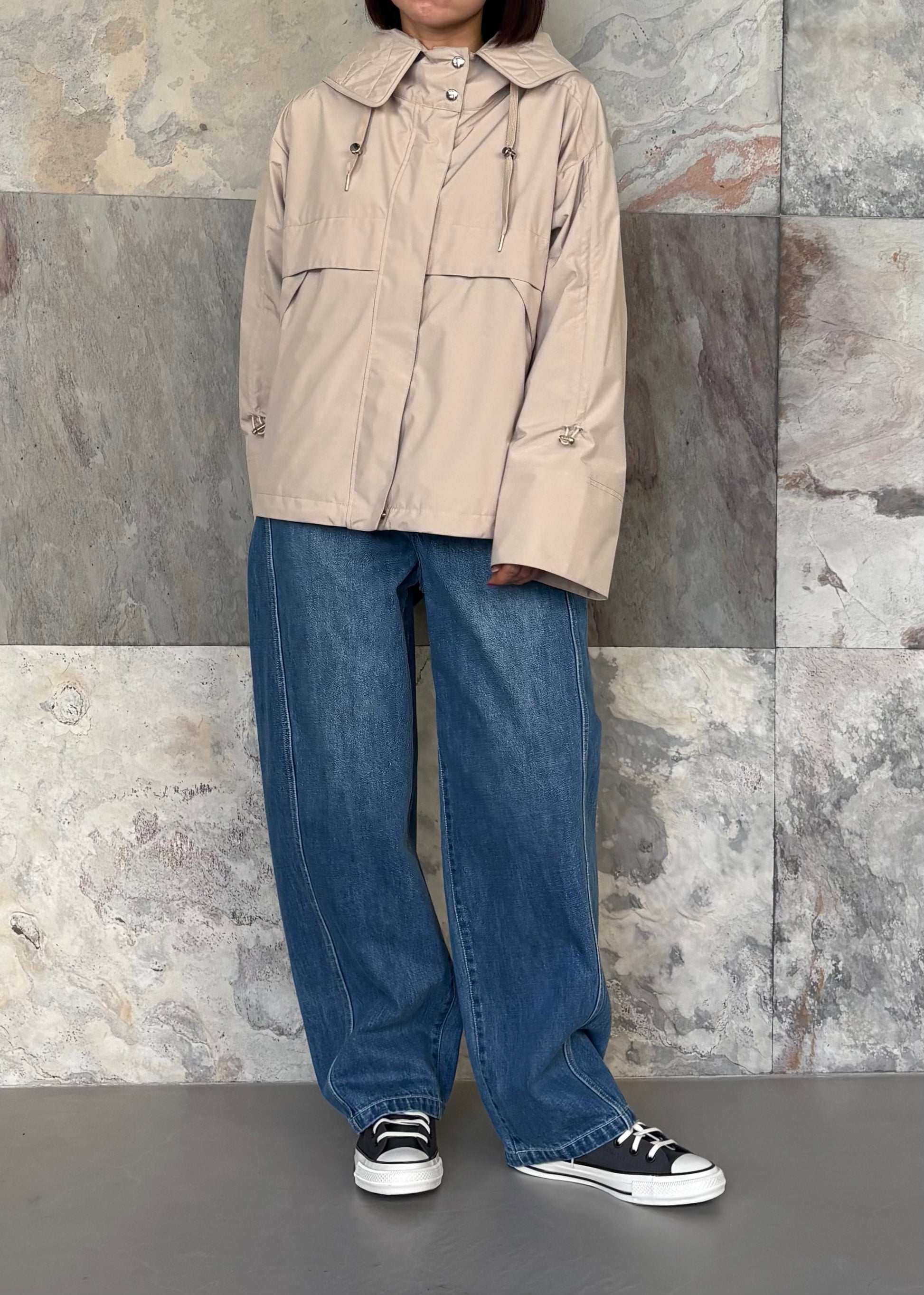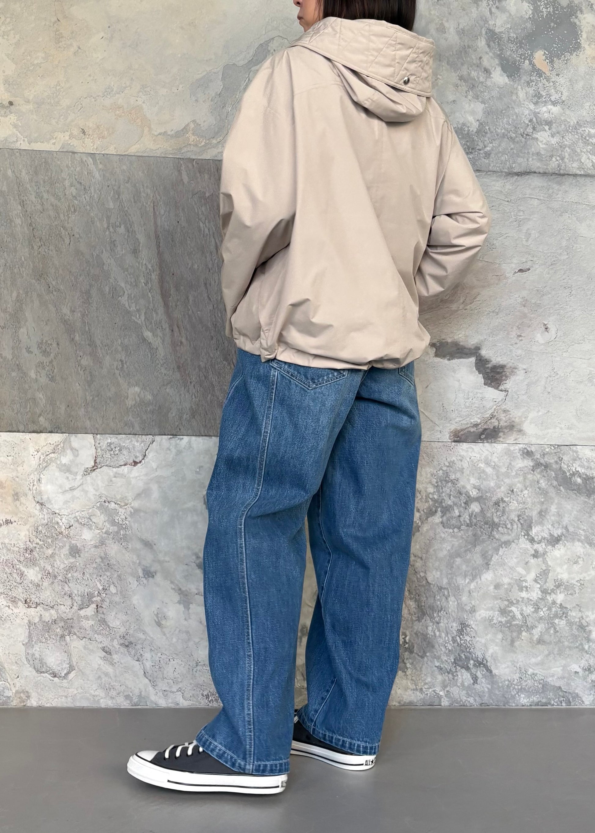 ポリエステル素材のマウンテンパーカーは防水吸水性に優れ雨や湿気にも強いのが特徴です。デザインのポイントは袖のドロストディティール。袖丈を調整できるだけでなく裾のドローコードを活用すればシルエットの変化も楽しめます。動きやすく高機能なライトアウターがコーディネートに新鮮な表情をプラスしてくれます。
