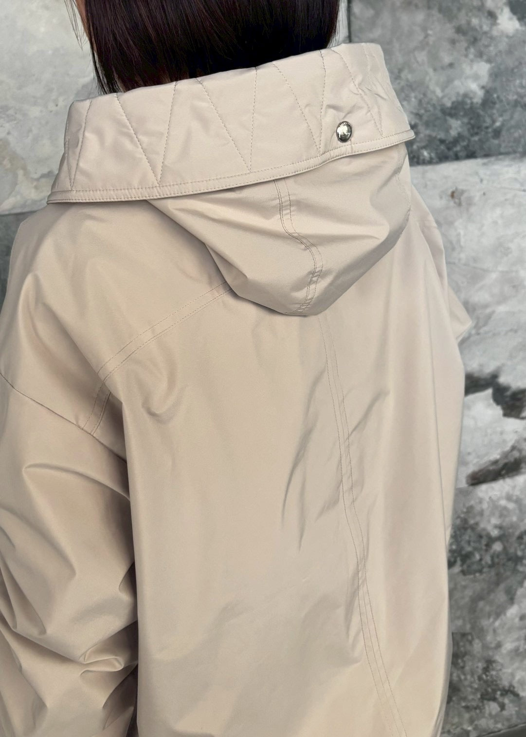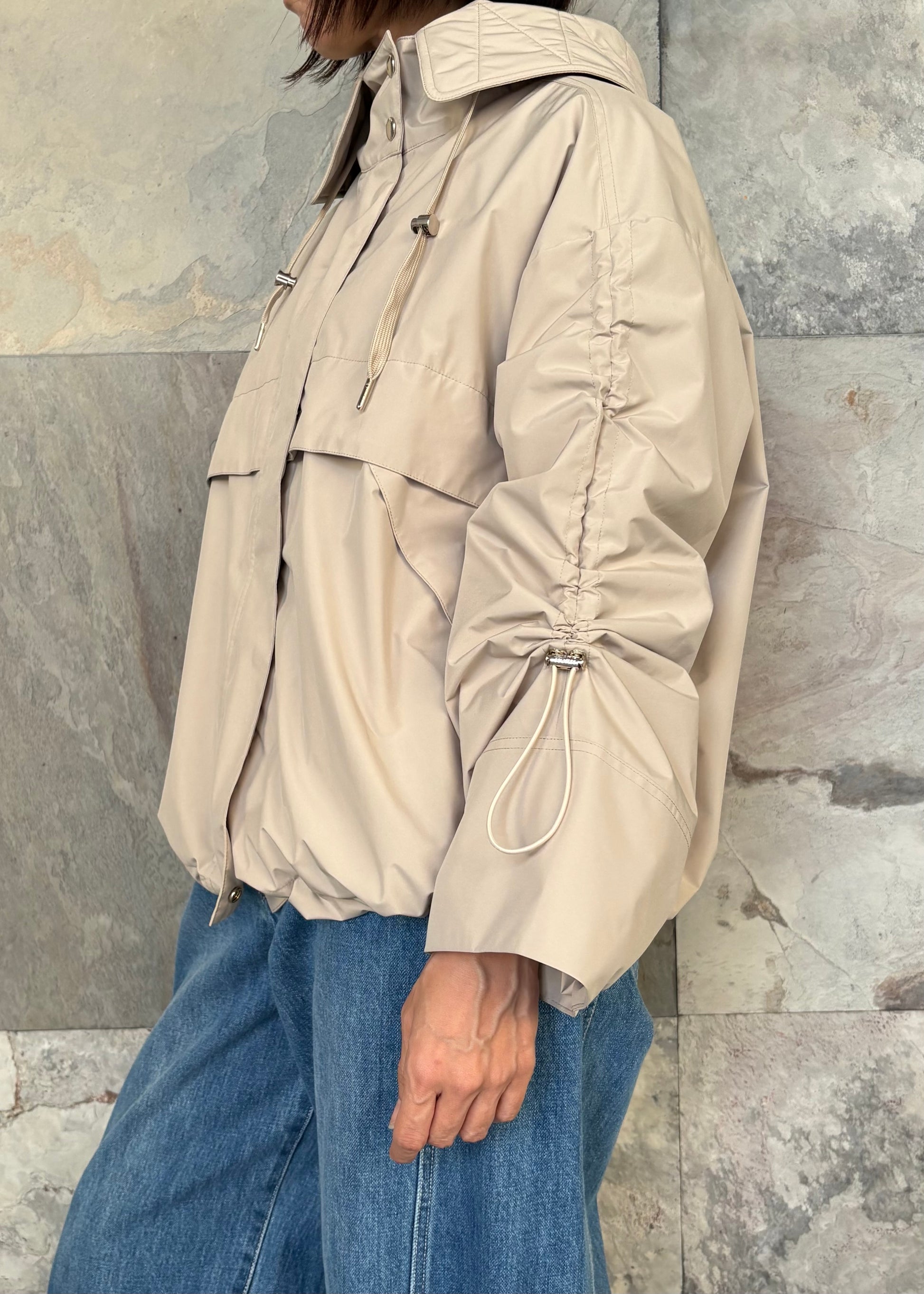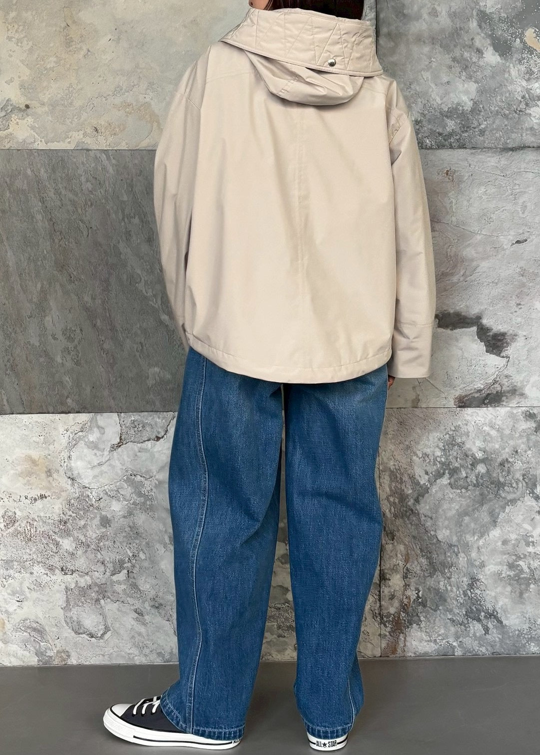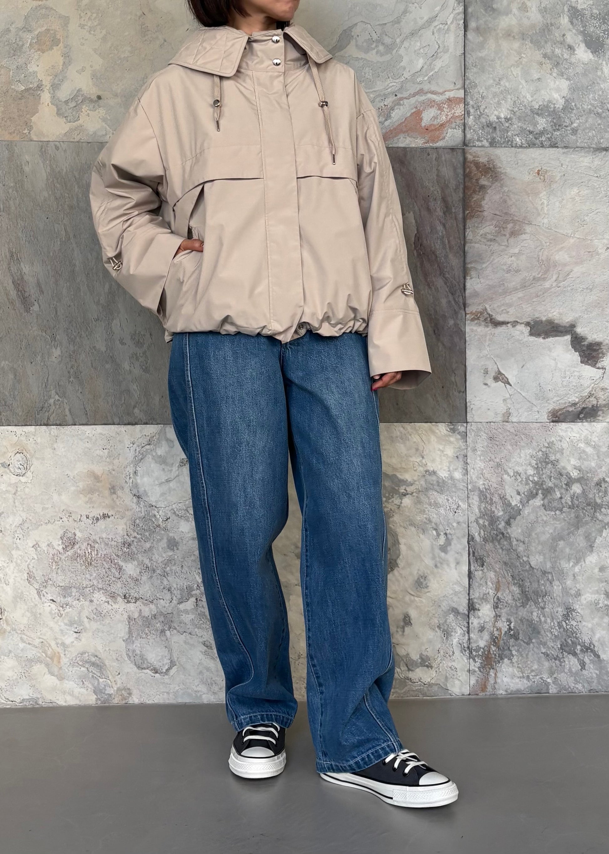 ポリエステル素材のマウンテンパーカーは防水吸水性に優れ雨や湿気にも強いのが特徴です。デザインのポイントは袖のドロストディティール。袖丈を調整できるだけでなく裾のドローコードを活用すればシルエットの変化も楽しめます。動きやすく高機能なライトアウターがコーディネートに新鮮な表情をプラスしてくれます。