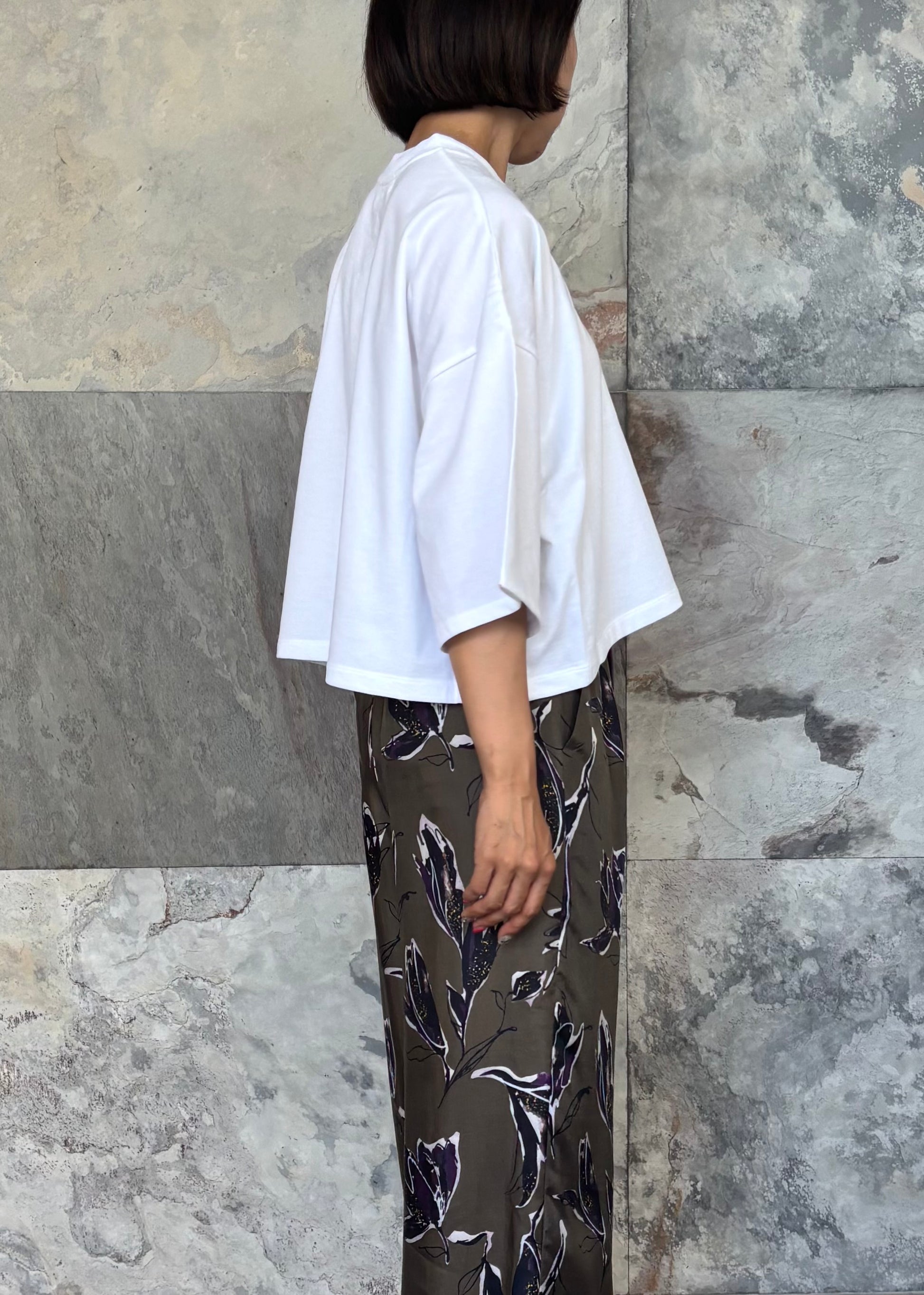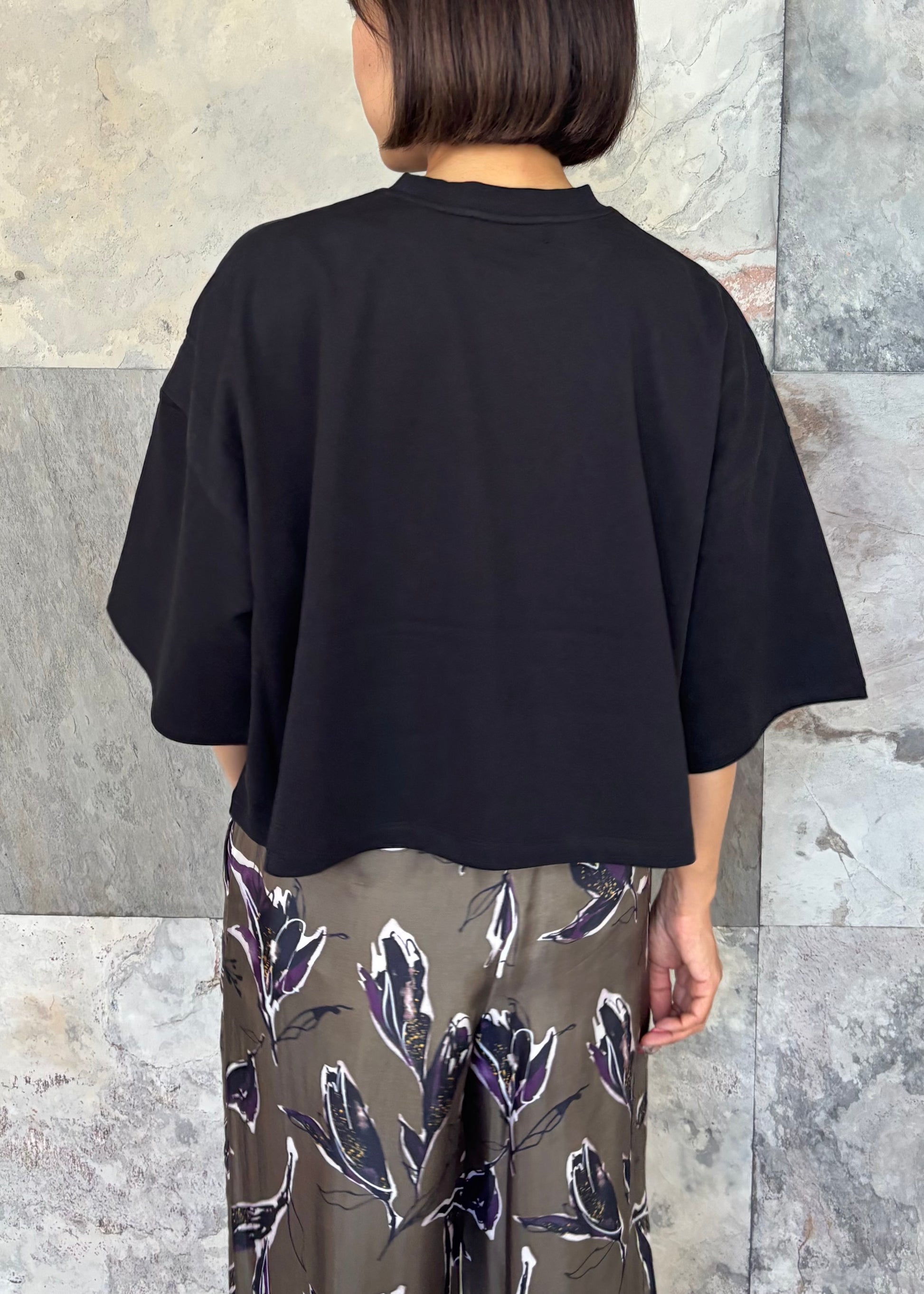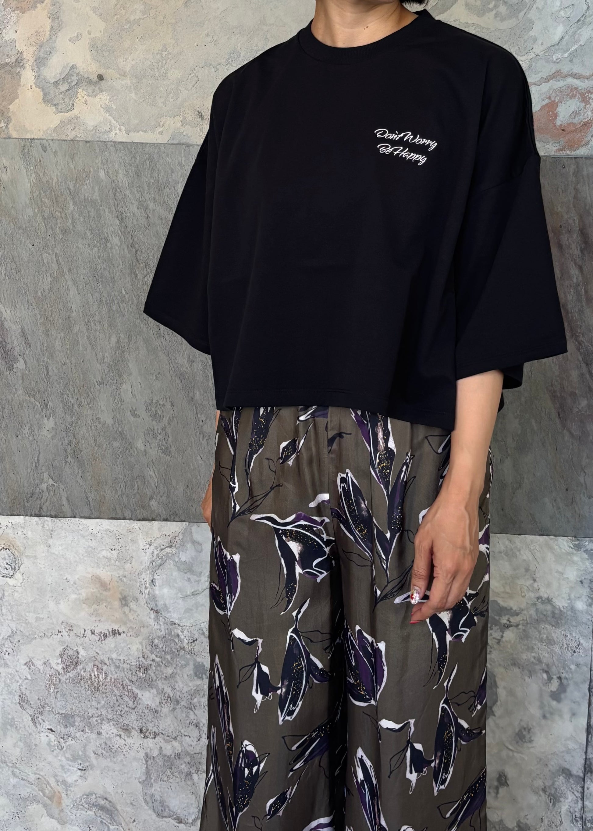 クロップド丈と肘まであるハーフスリーブのバランスが旬な印象のカットソー。ミニ裏毛素材を使用したソフトな風合いで、カジュアルすぎず上品さも兼ね備えています。『Don't Worry Be Happy』ロゴ刺繍入り。