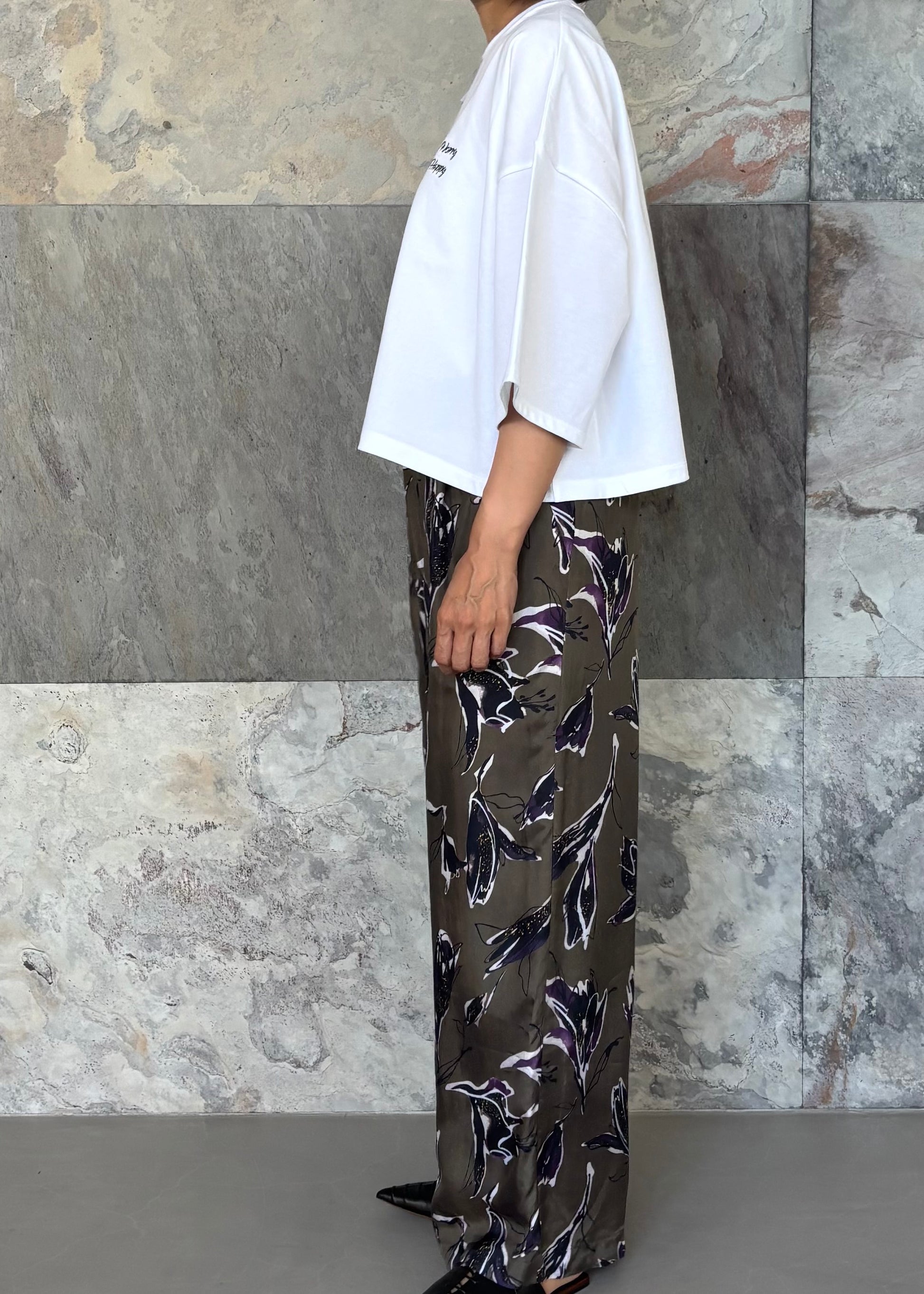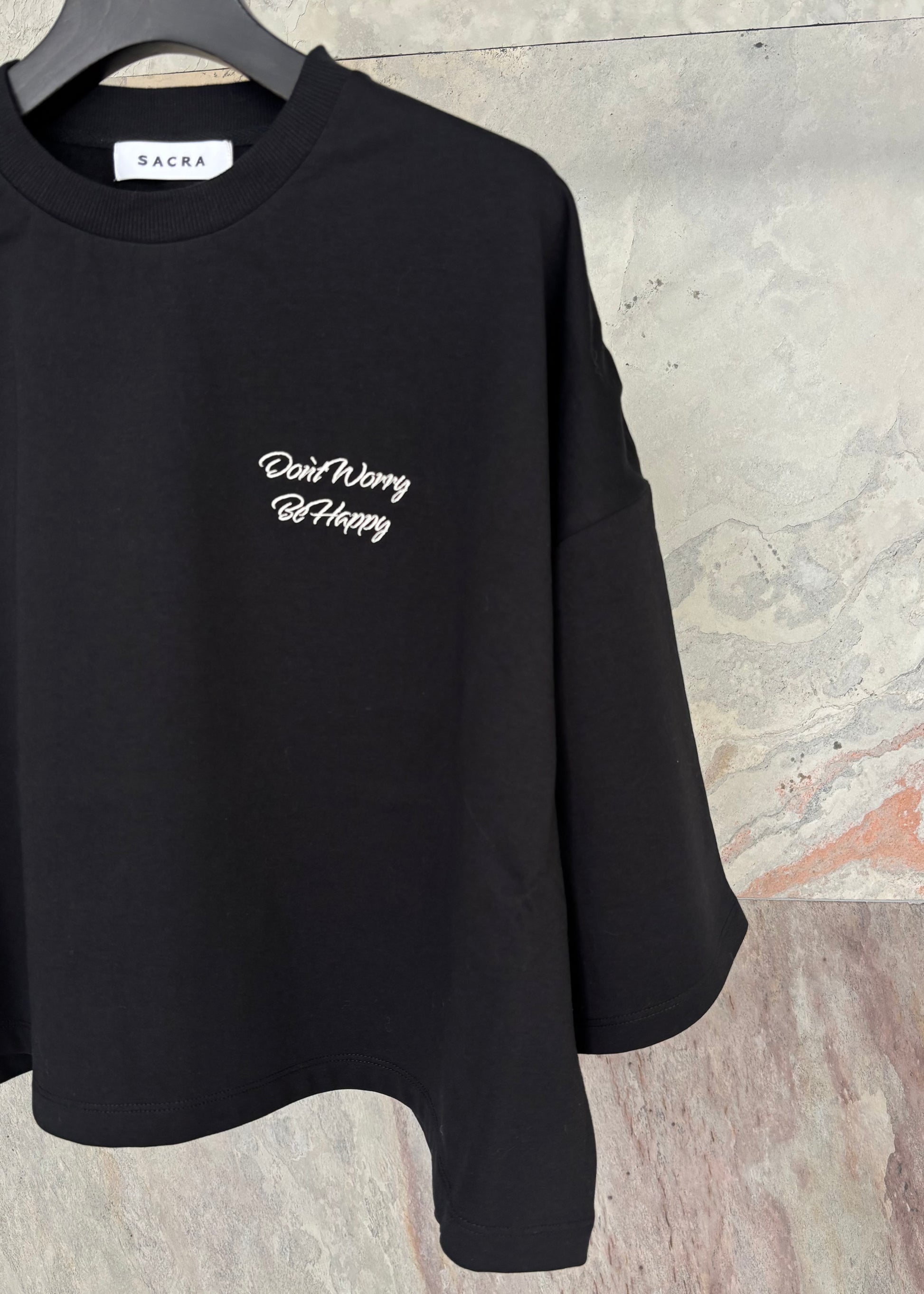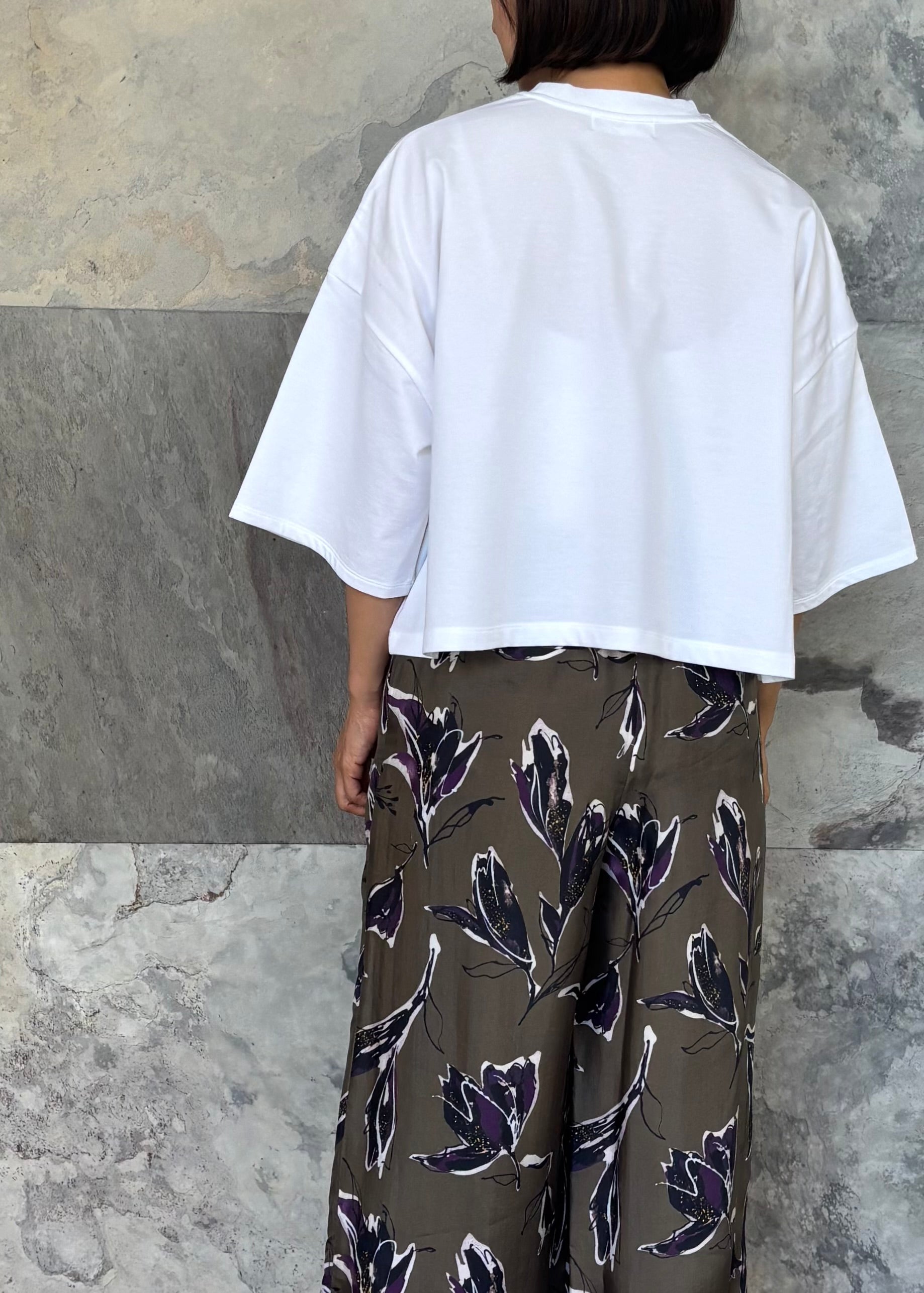 クロップド丈と肘まであるハーフスリーブのバランスが旬な印象のカットソー。ミニ裏毛素材を使用したソフトな風合いで、カジュアルすぎず上品さも兼ね備えています。『Don't Worry Be Happy』ロゴ刺繍入り。