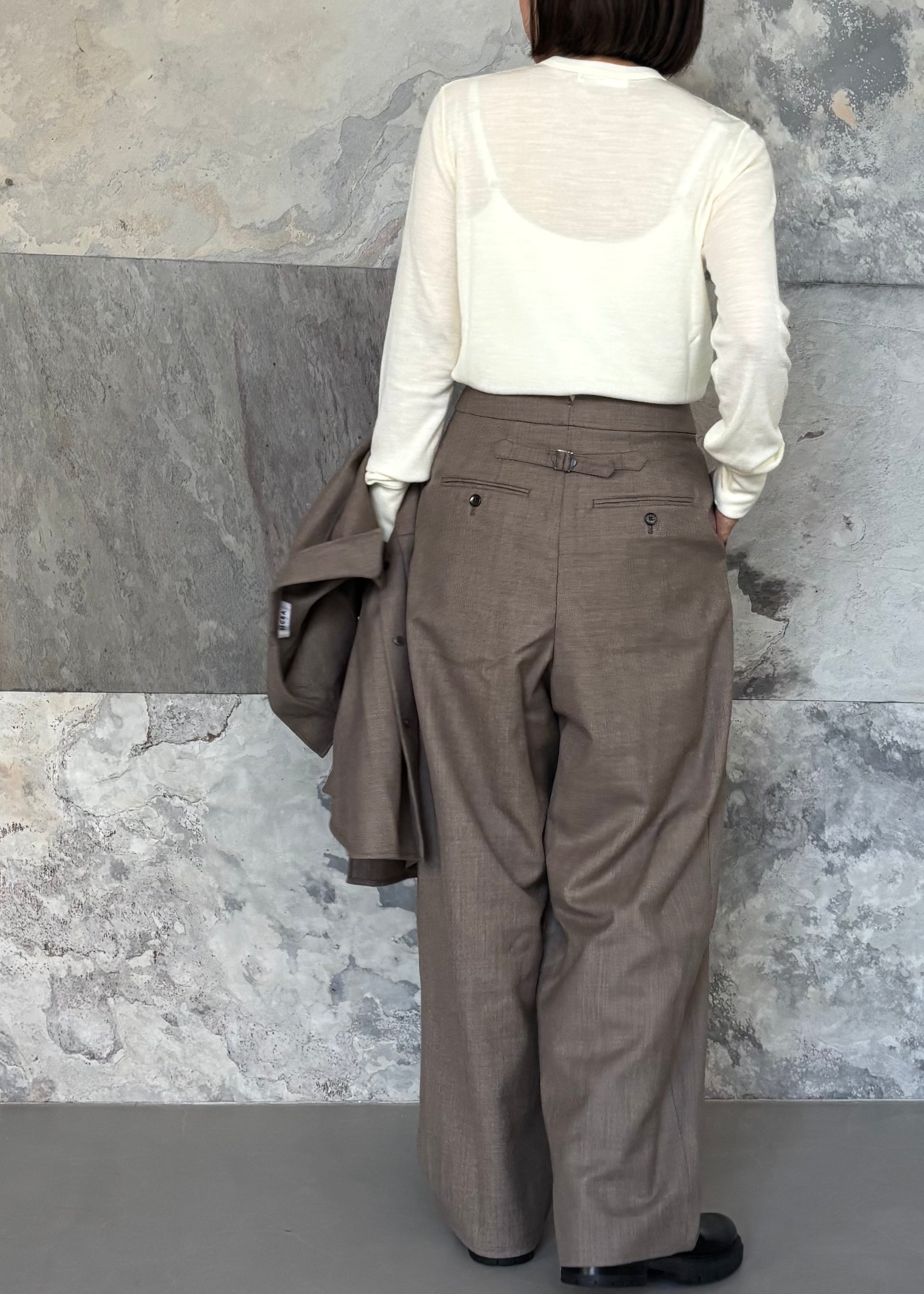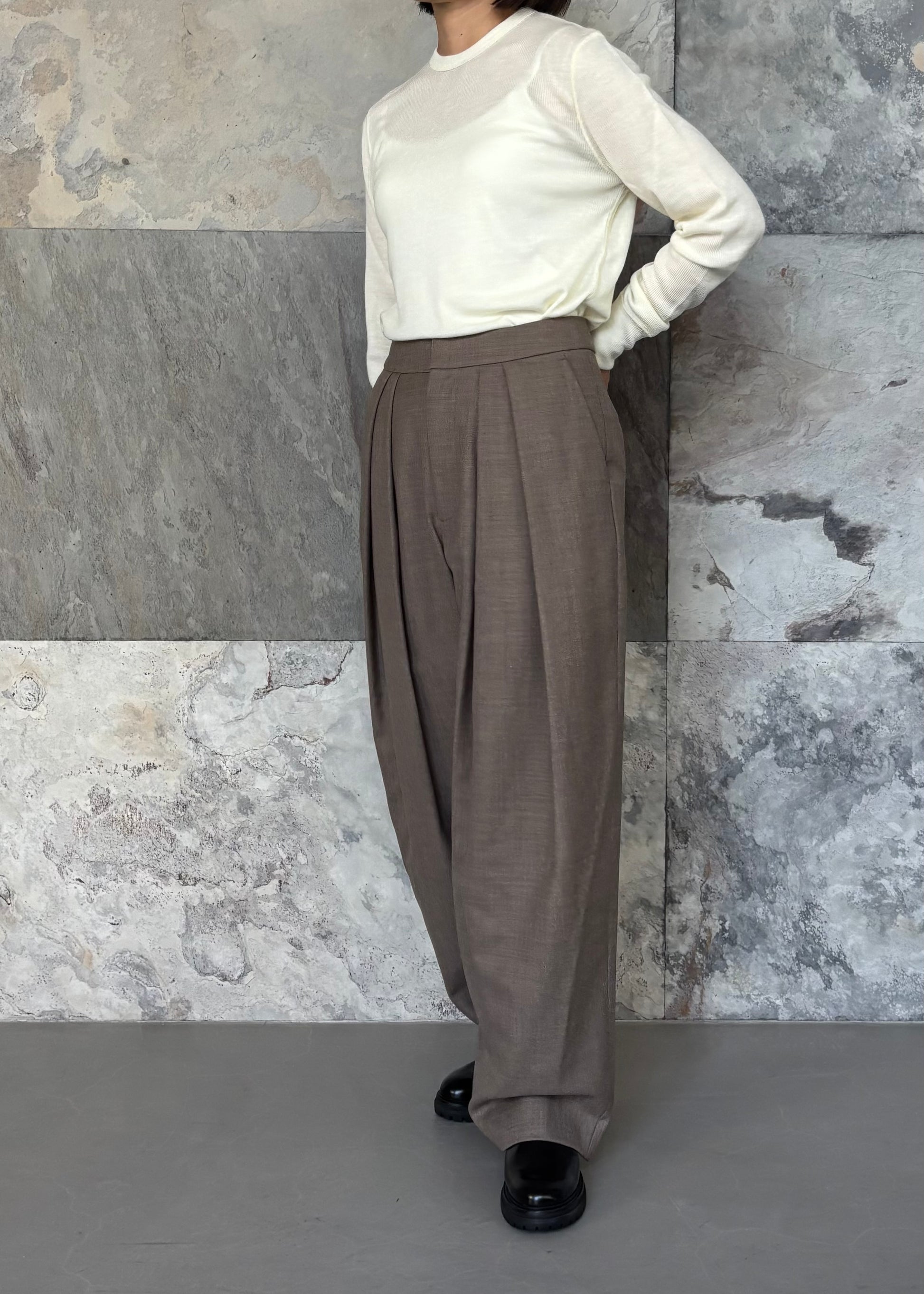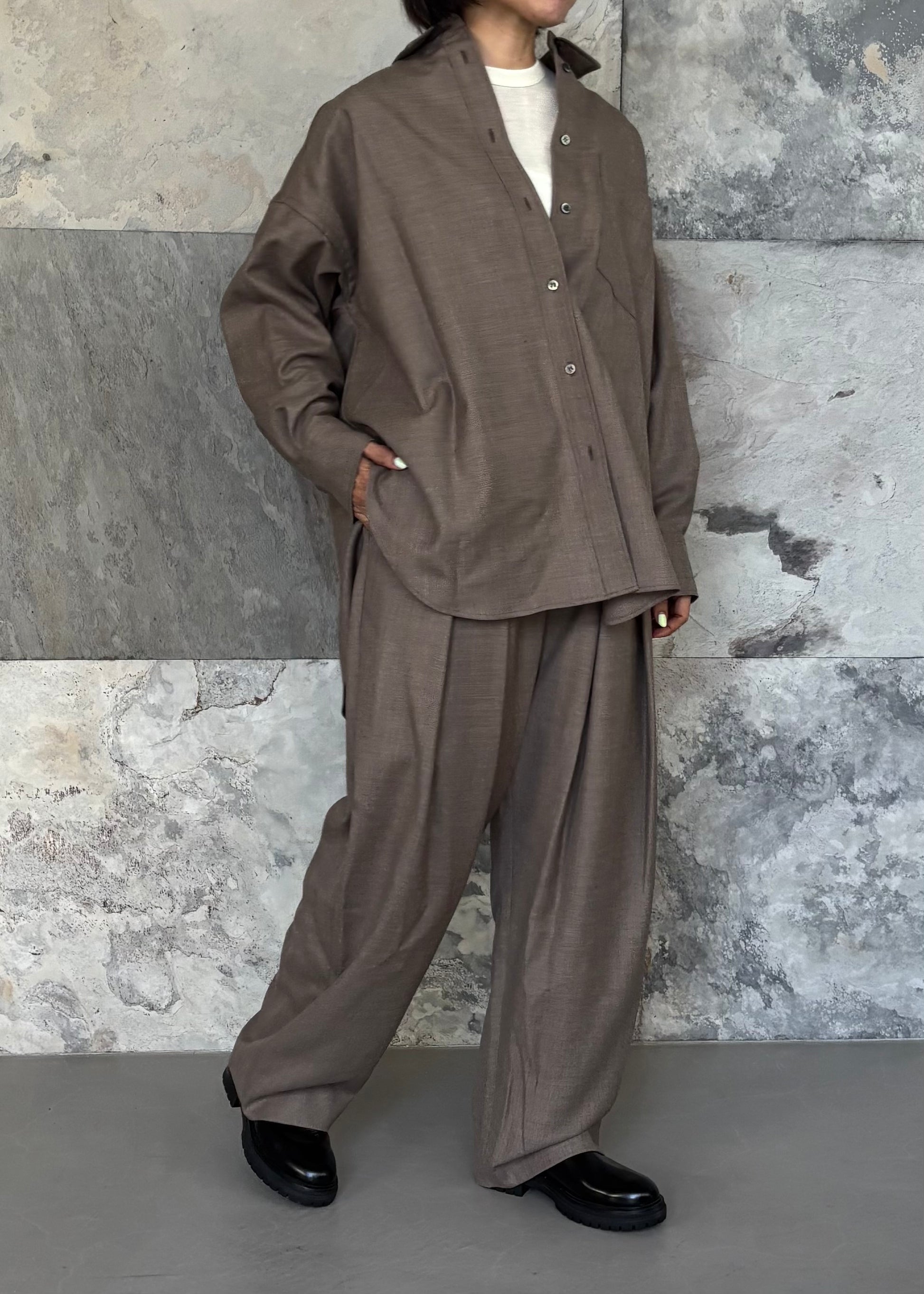 上品な光沢感と程よいハリ感が特徴のテーパードパンツ。上質なウールならではのきめ細かなメランジ感のある表情が魅力。フロントタックからなるワイドシルエットと、裾にかけてテーパードさせたラインがマニッシュな雰囲気を醸し出します。
