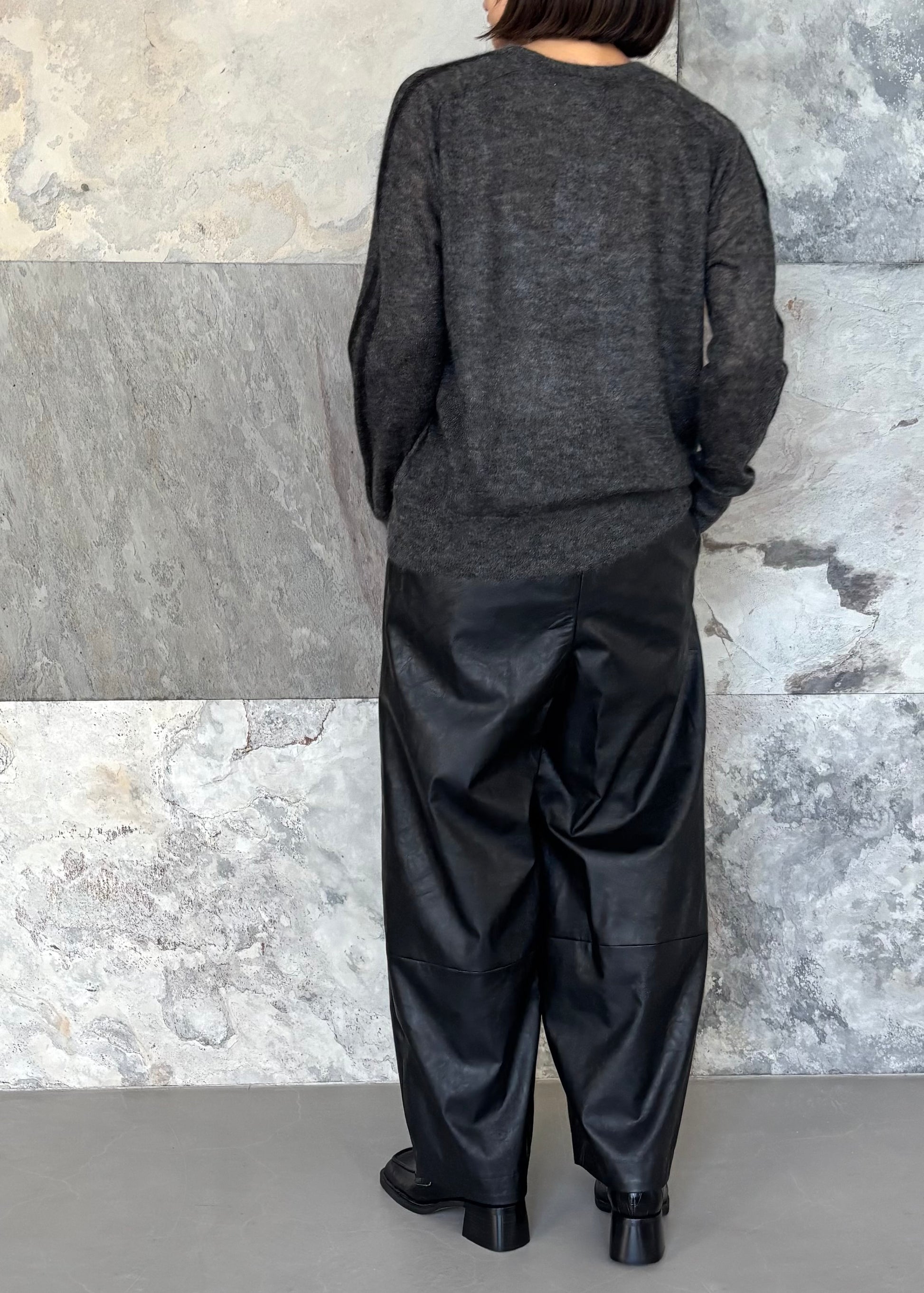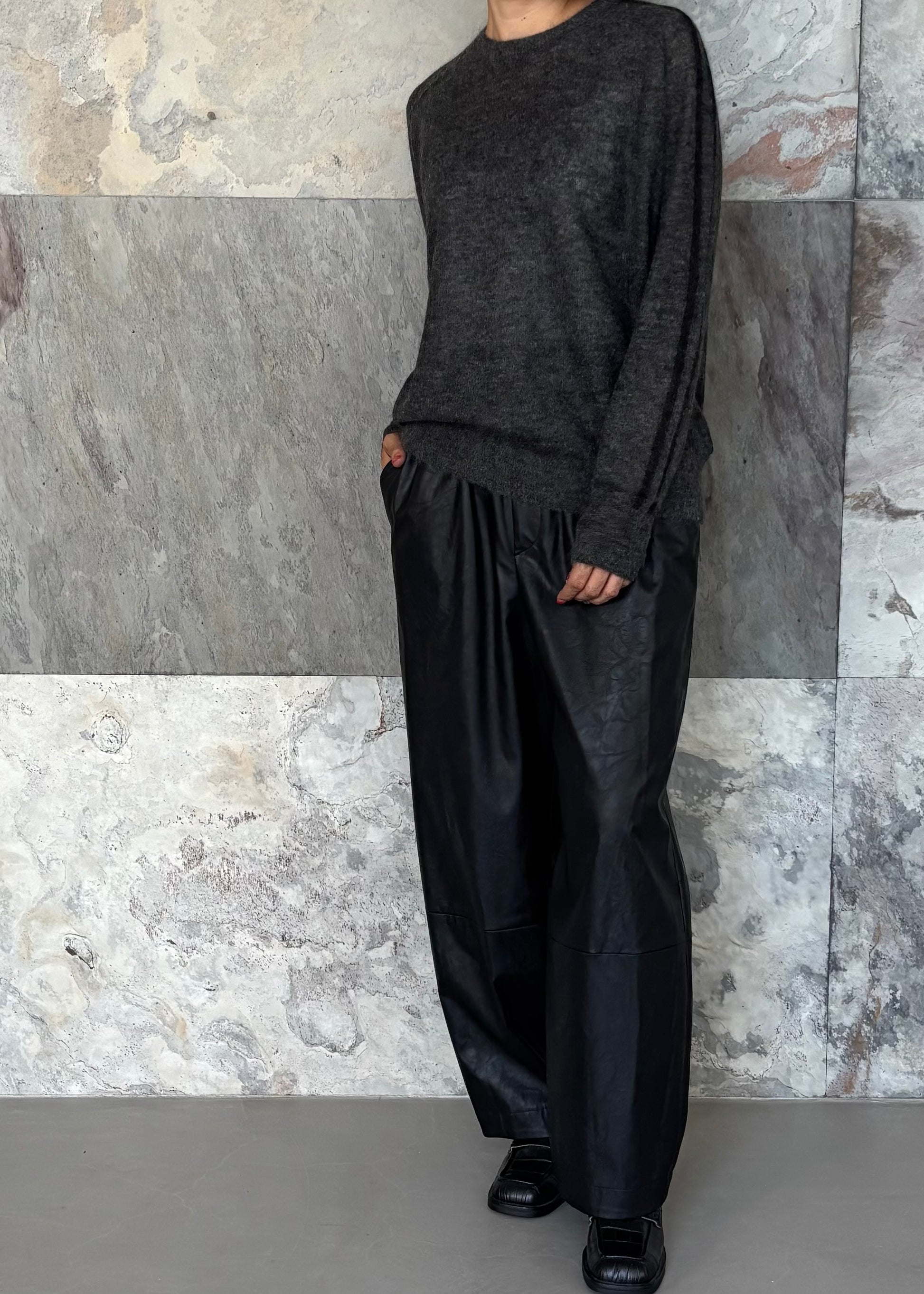 上質なエコレザーを使用したカービーワイドパンツ。柔かな履き心地で、ウエストはリラックス感のあるゴム仕様、内側のドローストリングでサイズ調整が可能。ひざ下切替えでほんのりカービーさせたワイドシルエットがモード感のある一着です。