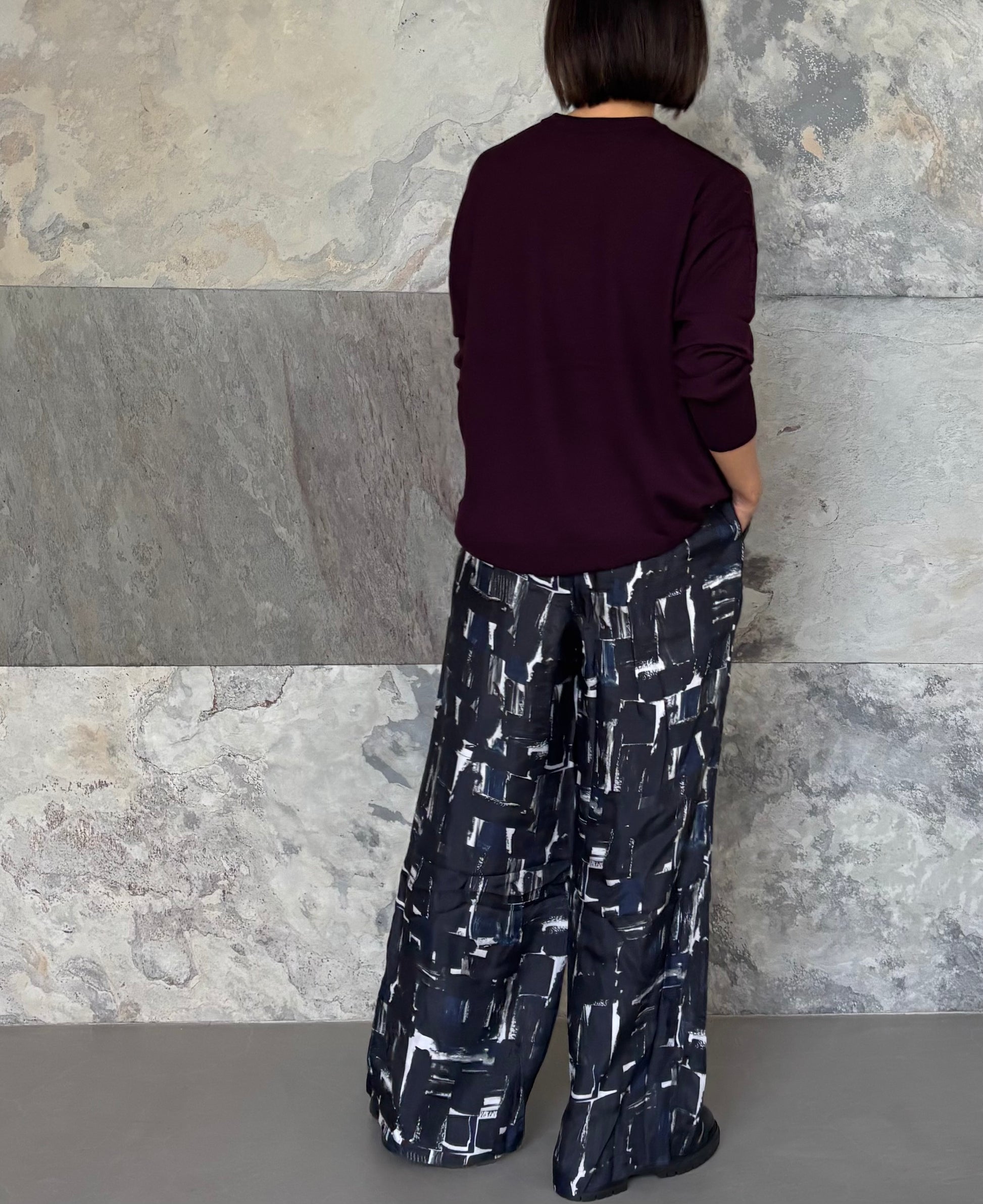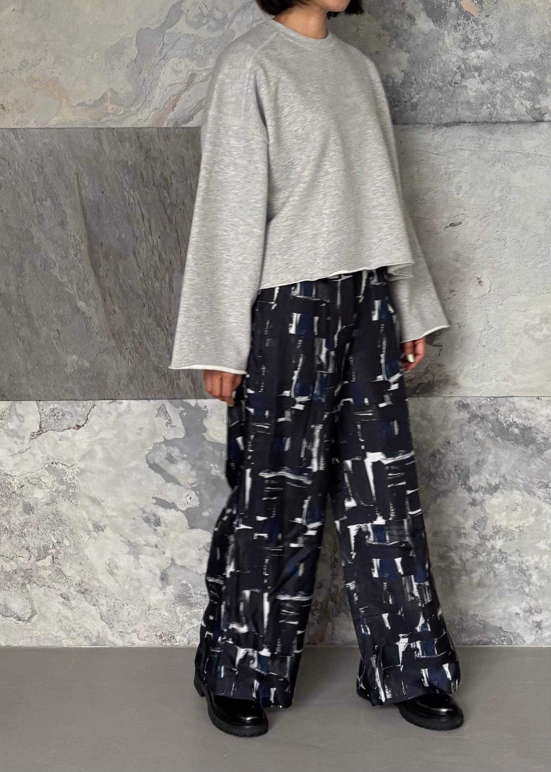 シックな色合いと抽象的なブラッシュペインティング柄が魅力のSACRAオリジナルプリントパンツ。リラックスムード感じるウエストゴム仕様のワイドパンツは幅広い着こなしが楽しめるスタイリング映えする一着です。