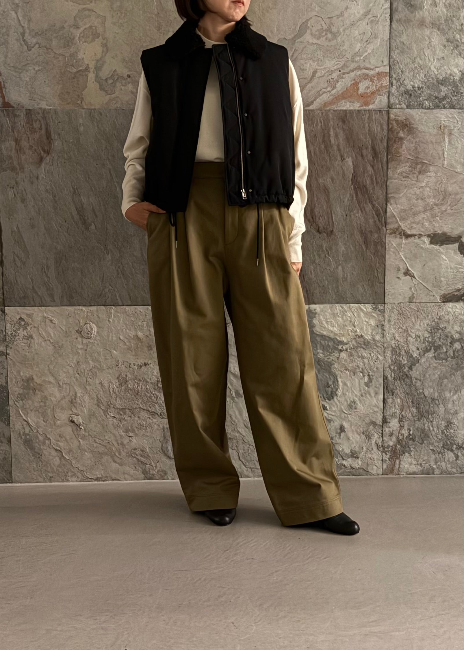 ほんのり丸みを帯びたカービーシルエットのワイドパンツはモードカジュアルな雰囲気に。絶妙な深い色合いのカーキカラーも新鮮でスタイルをアップデートしてくれるシーズンレスな一着です。