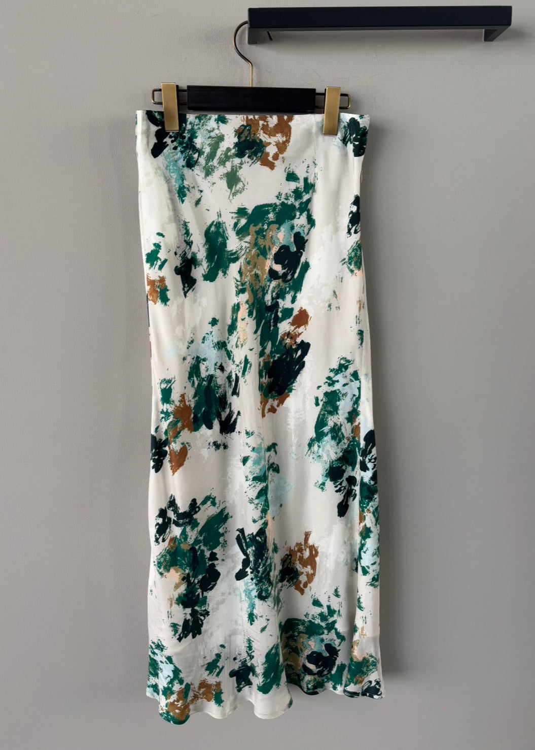 SACRAオリジナルプリントのロングスカート。抽象的な絵画のような雰囲気が魅力の花柄は光沢感とドレープ性が特徴のキュプラレーヨン素材にのせて新鮮な春らしさを表現。バイヤス裁ちで仕立てたスカートは、スッキリとしたナローラインで、ボリュームトップスとの相性も◎。足元しだいで様々なシーンで活躍するアイテムです。