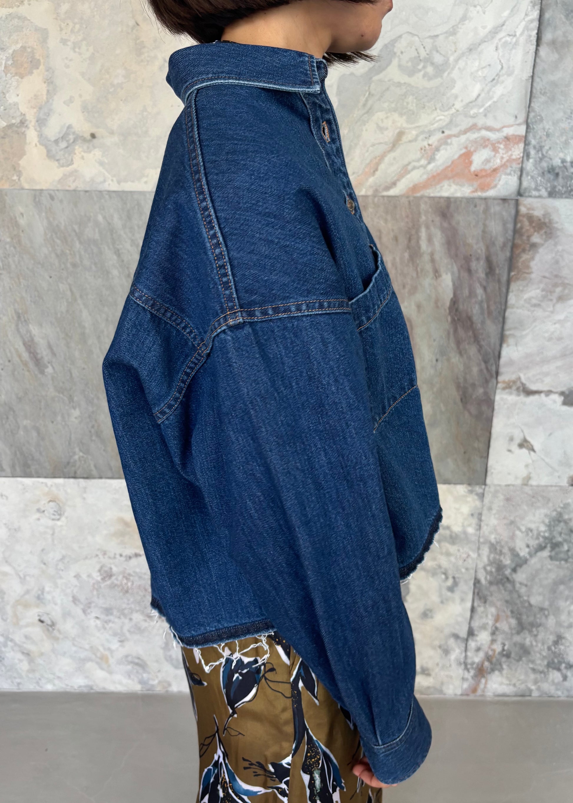 11ozデニムを使用したクロップドシャツ。着丈のバランスと生地色を残すようにカットオフ加工したヘムディテールが魅力。深みのあるネイビーカラーが大人な印象に。羽織りとしても活躍する一着です。