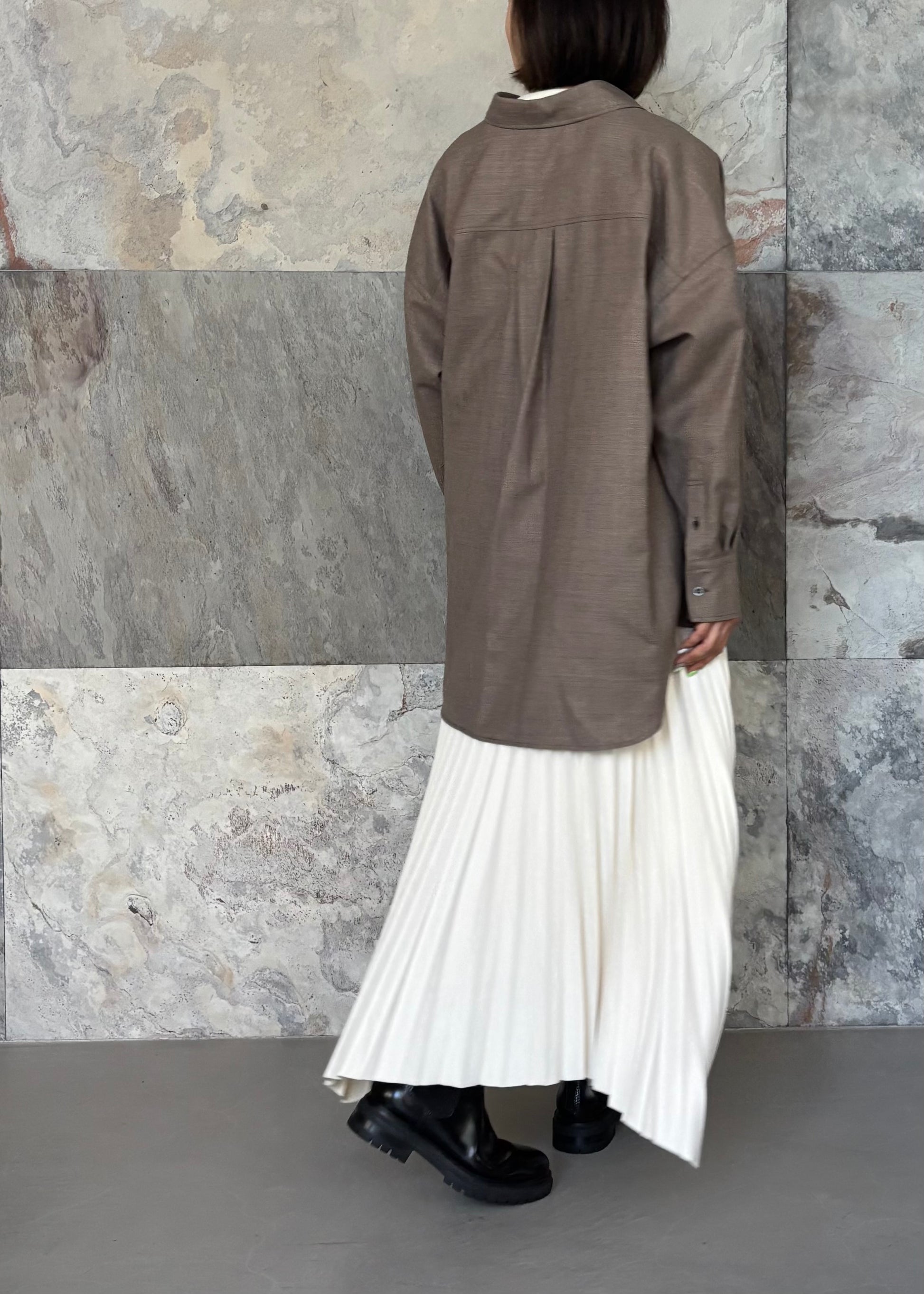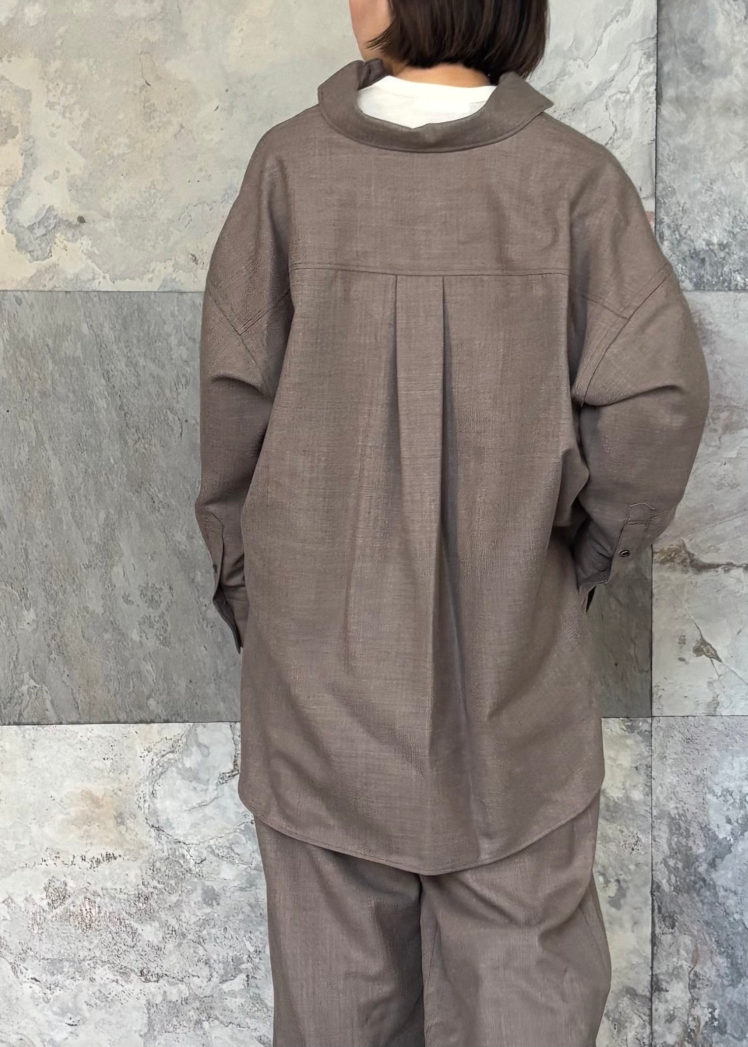 上品な光沢感と程よいハリ感が特徴のシャツ。きめ細かなメランジ感のある表情が魅力。ゆったりとしたシルエットで仕立てたオーバーサイズのシャツは、羽織としても幅広いスタイリングにプラスオンできる着回し抜群の一着です。