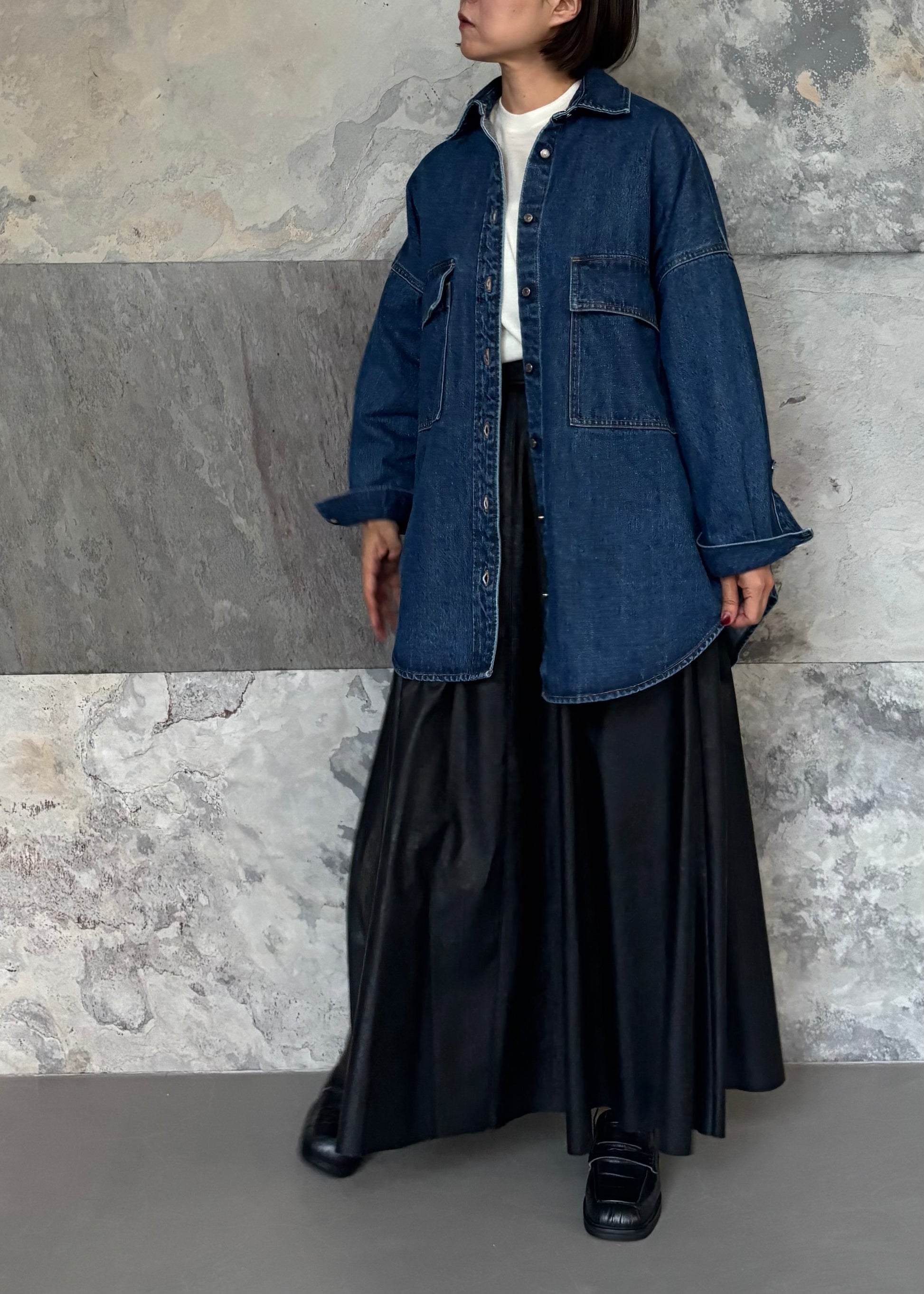バランスの良い大人な色合いが魅力。ハリのある素材感を活かしたオーバーシルエットが独特なこなれ感を演出してくれます。アウター感覚のシャツジャケットは羽織りとしてもシーズンレスで活躍する一着です。