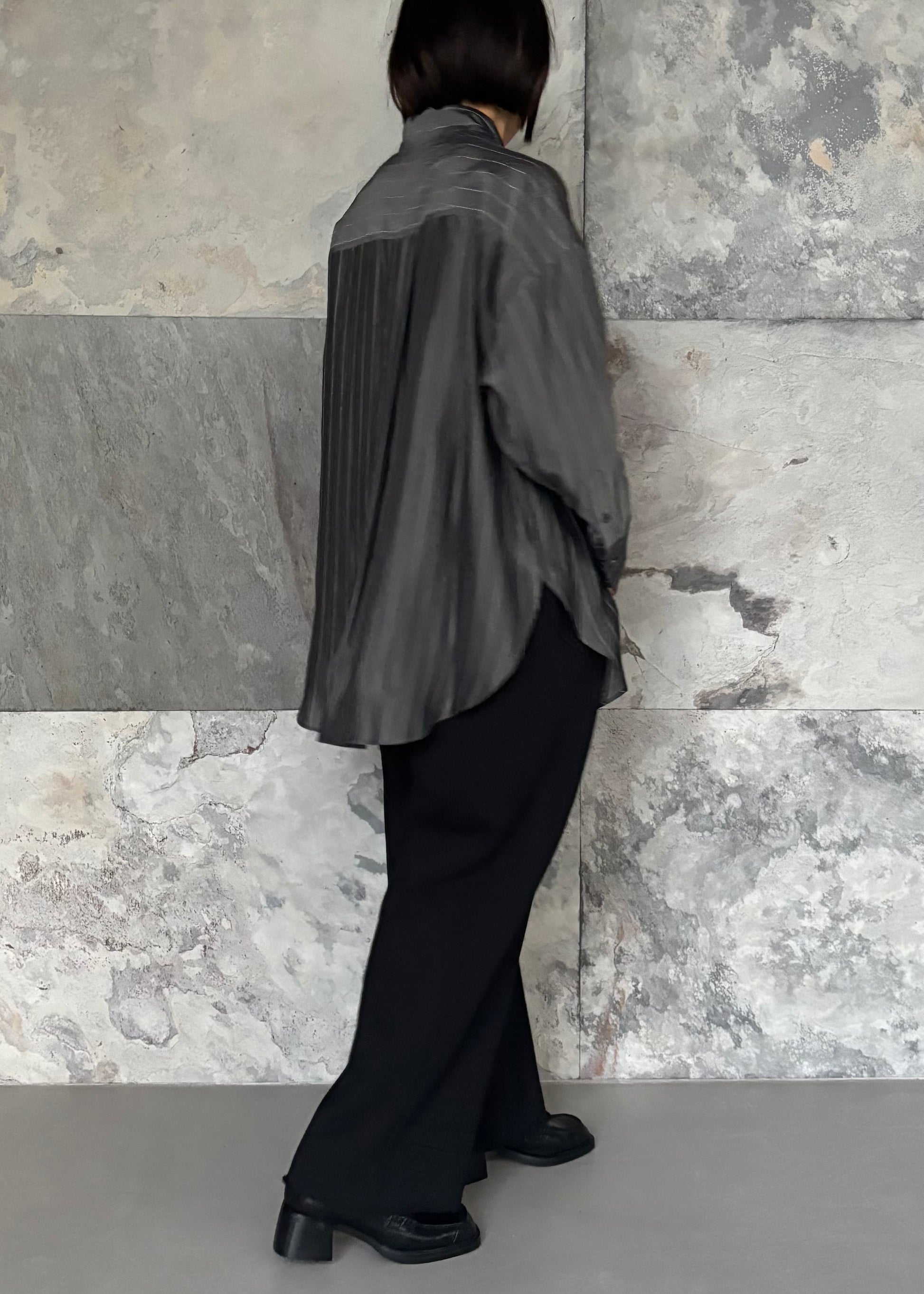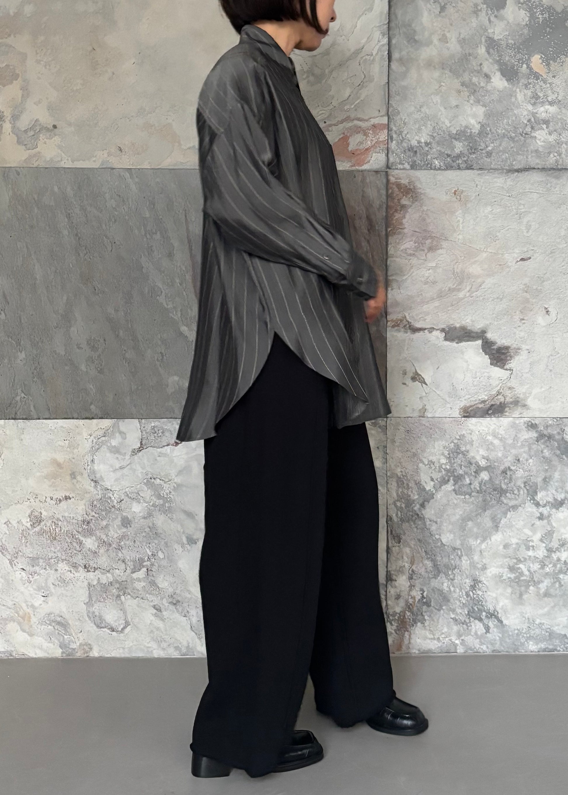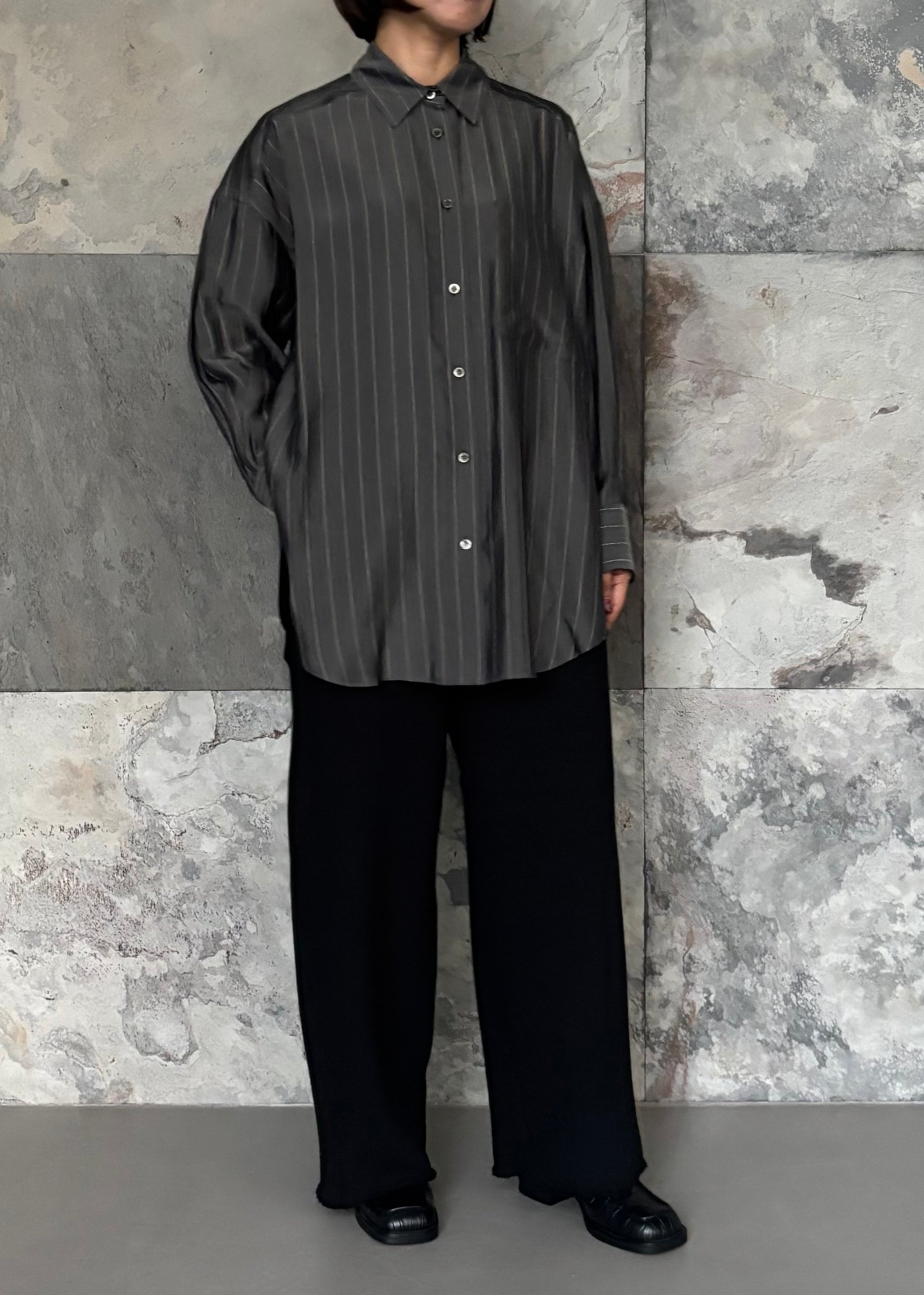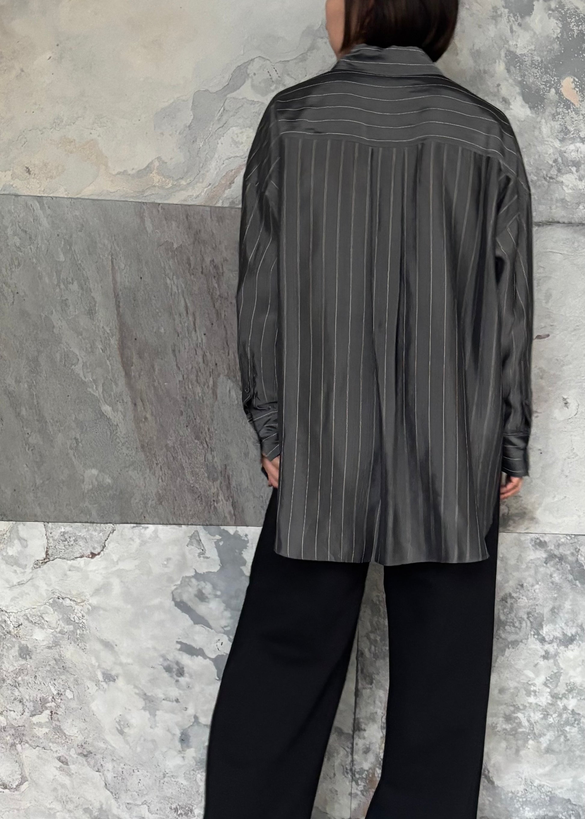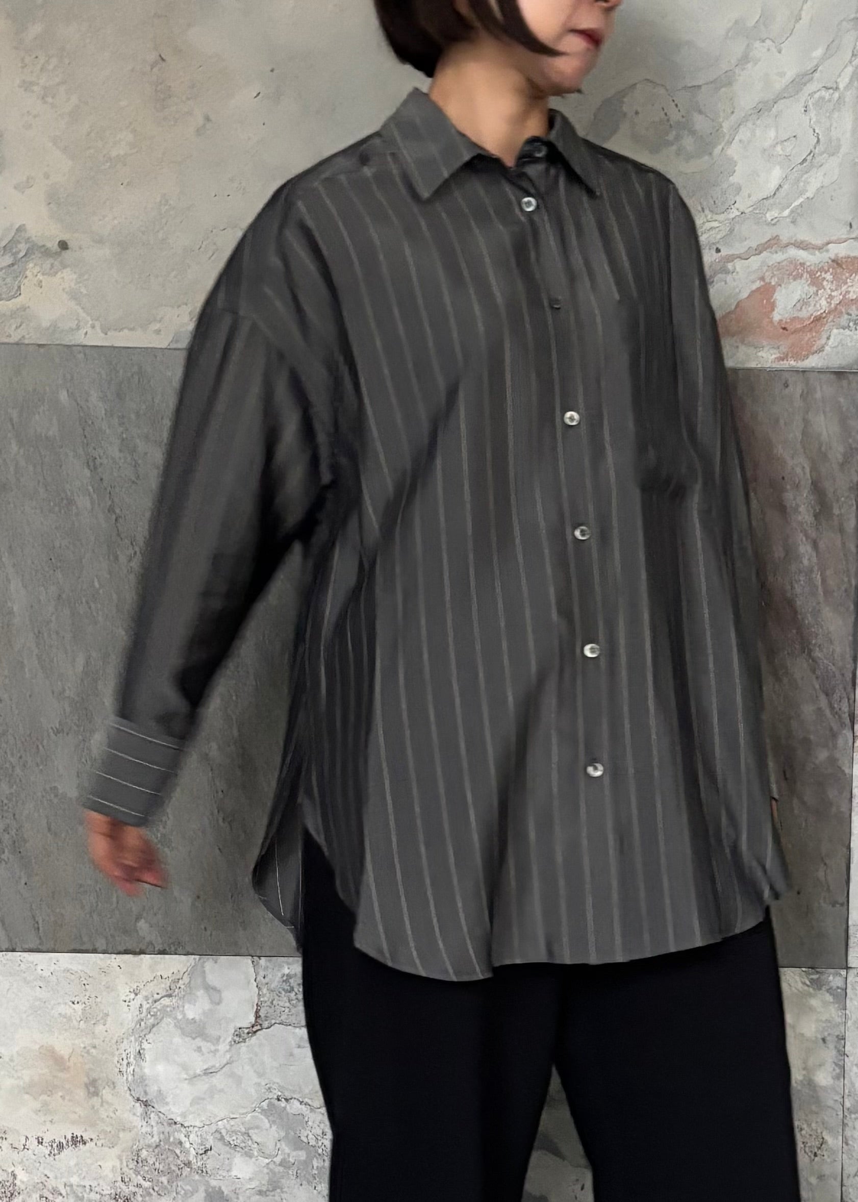 上質なキュプラ先染めストライプ生地を使用したビッグシャツ。キュプラのシルキーな風合いと独特な深みのある色合いが特徴です。マニッシュな雰囲気をもちながら光沢をともなう素材感で女性らしさも併せ持つ、シーズンレスに活躍するアイテムです。