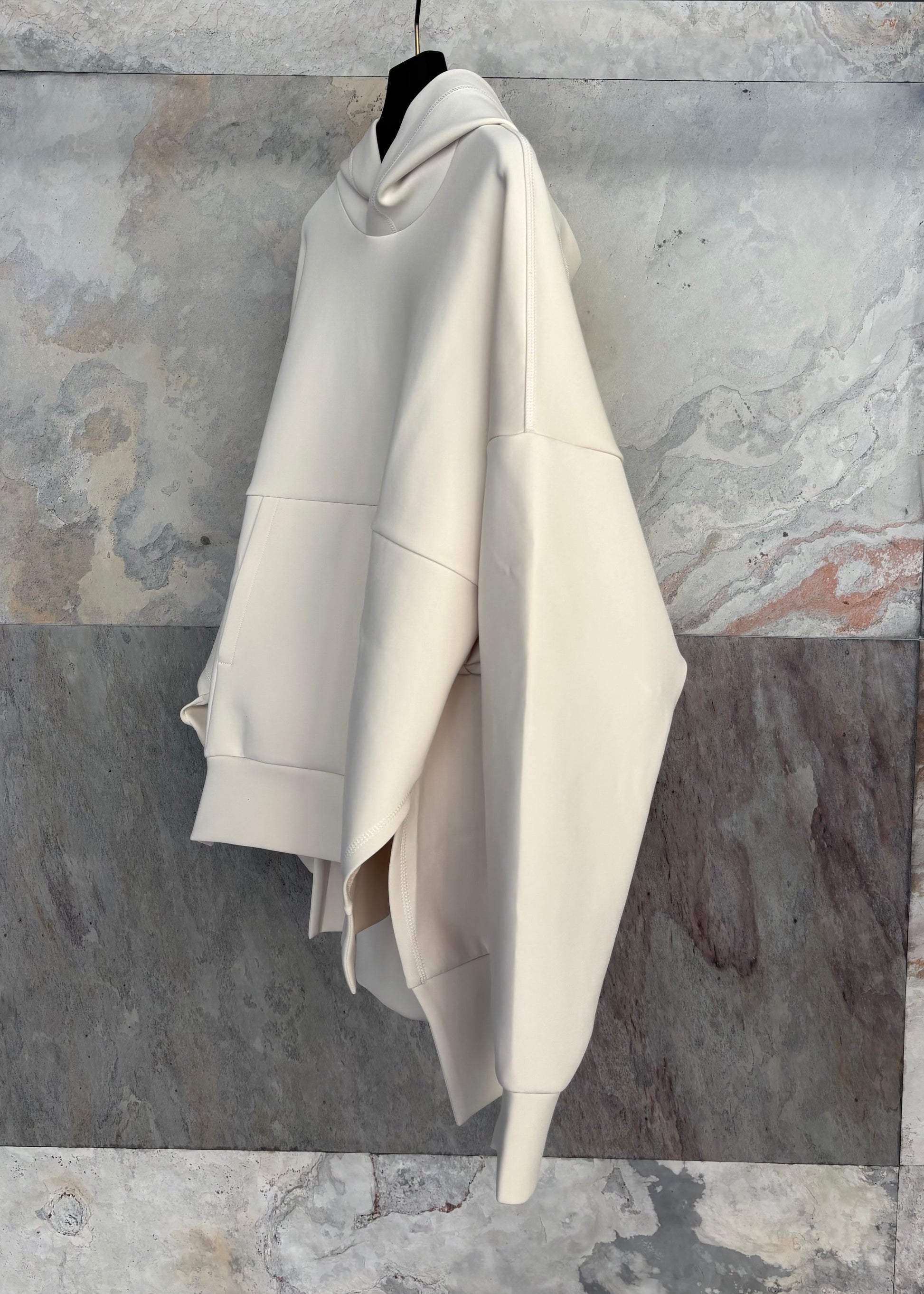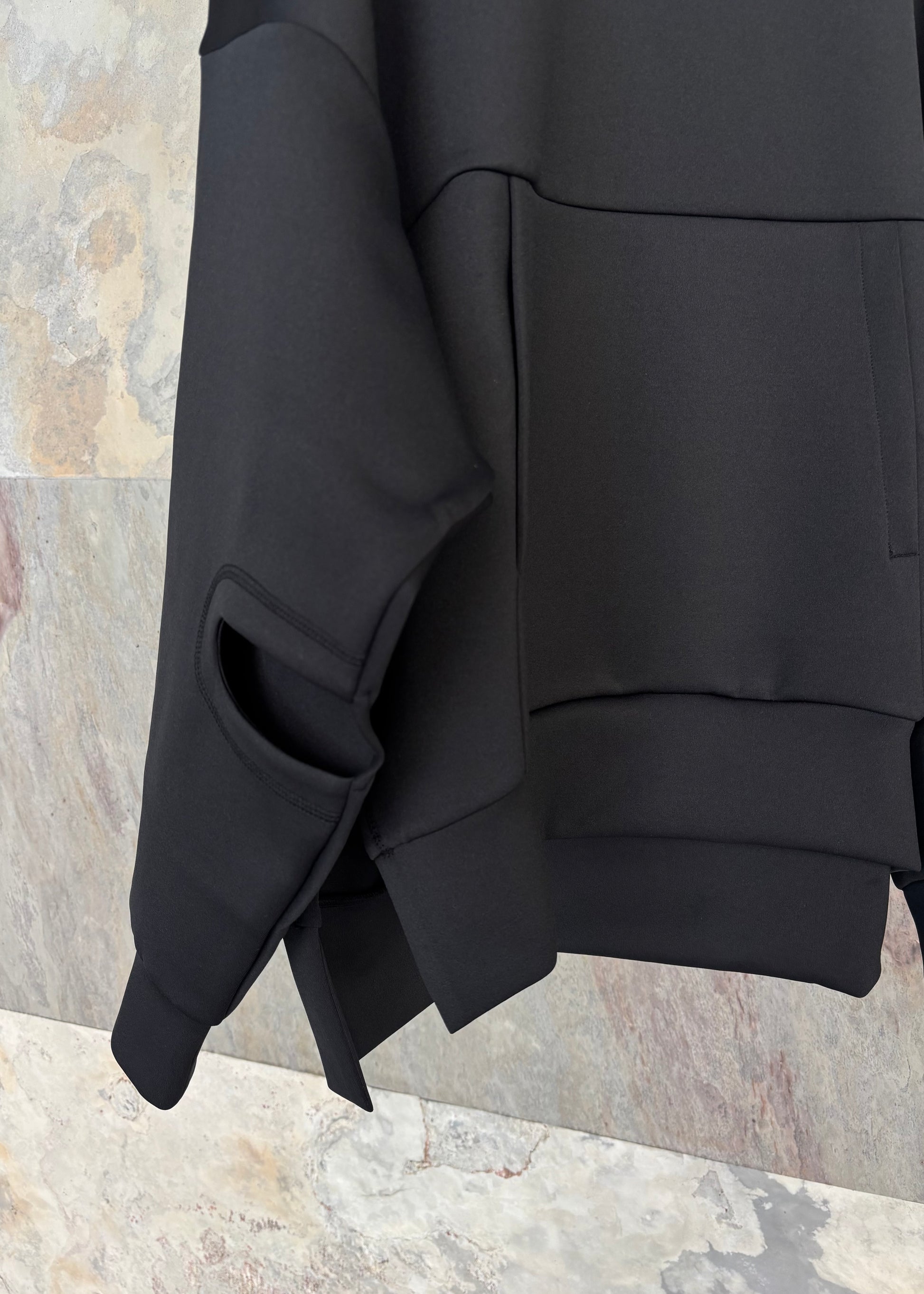 リサイクルポリエステルを使用したハイゲージダンボールニットです。強力な伸縮性と独特のドレープが特徴で特殊柔軟による加工で肌触りの良い風合いに仕上げています。脇にスリットが入ったゆったりとしたサイズ感のプルオーバーパーカー。ひじの内側に開けた穴が特徴的で穴から手を出しても着られるデザインになっています。前後差のある着丈もポイントです。