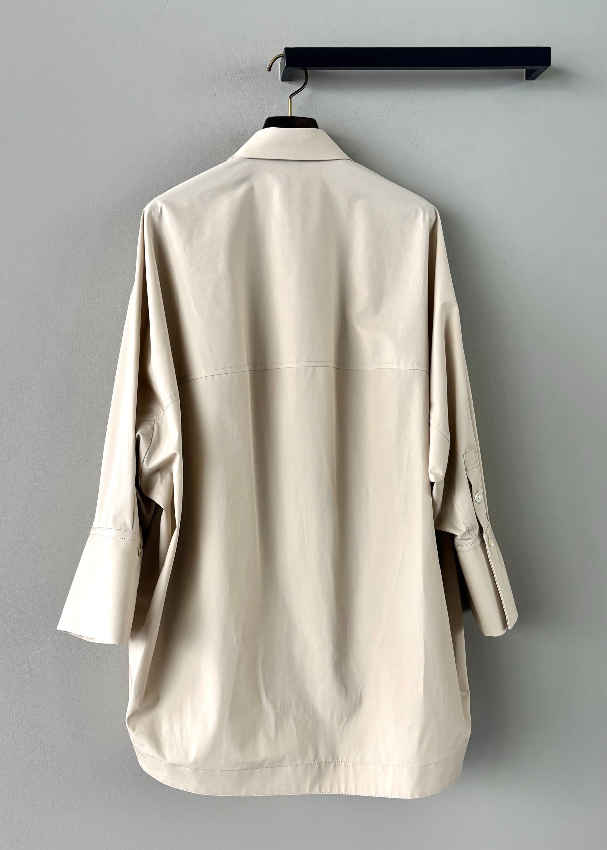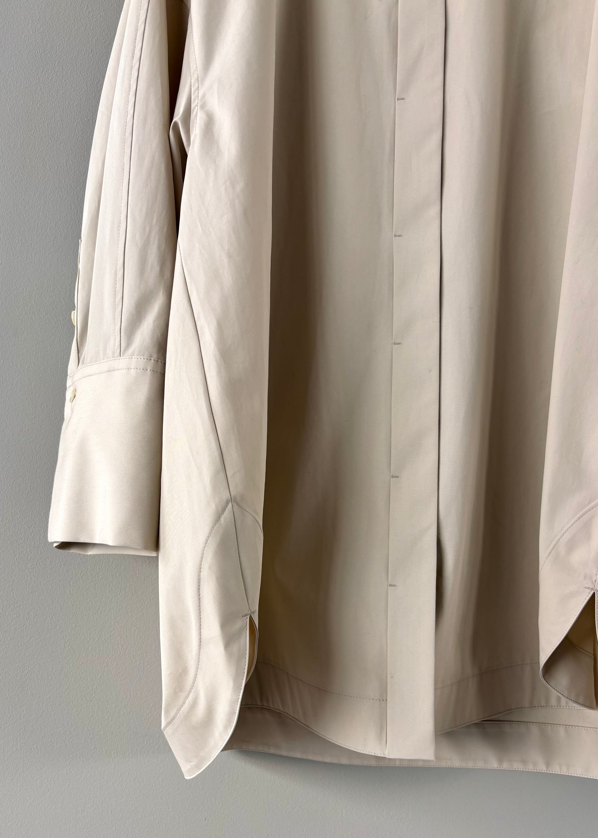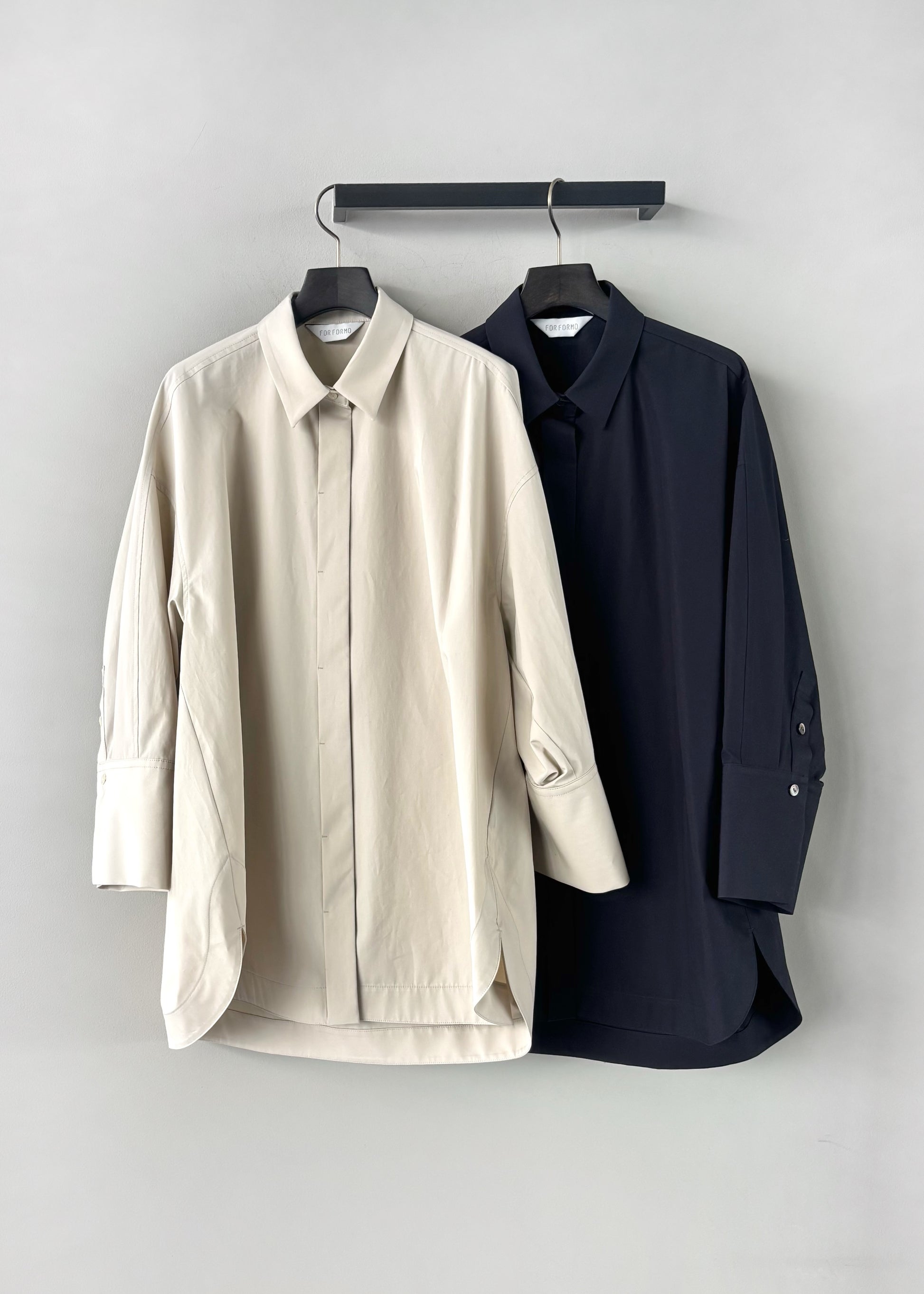 丸みのあるラインを活かした、リラックス感のある独特の「form(フォルム)」が特徴のシャツアイテム。ハイカウント素材を採用し、防風効果を備えている為、軽やかな羽織りとしても便利です。袖はダブルカフス仕様。シンプルで潔いデザインながら、forformoらしさを加えることで、さりげなくおしゃれを演出。春から夏にかけて紫外線対策としても活躍し、長いシーズンにわたって重宝するアイテム。シーンを選ばずに使える万能な一着です。スリムなパンツやテーパードラインのボトムスとのスタイリングがおすすめです。