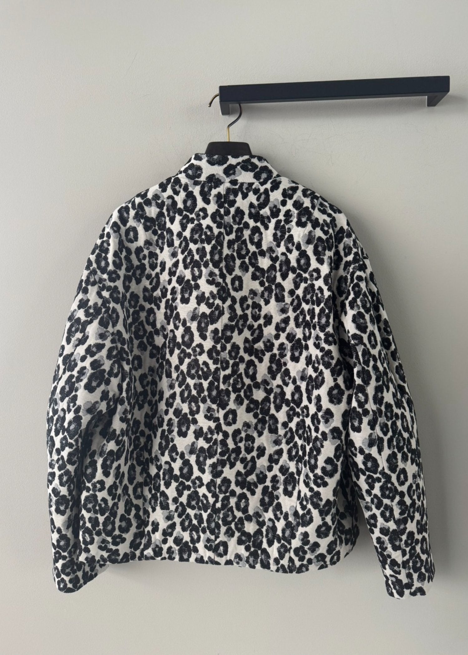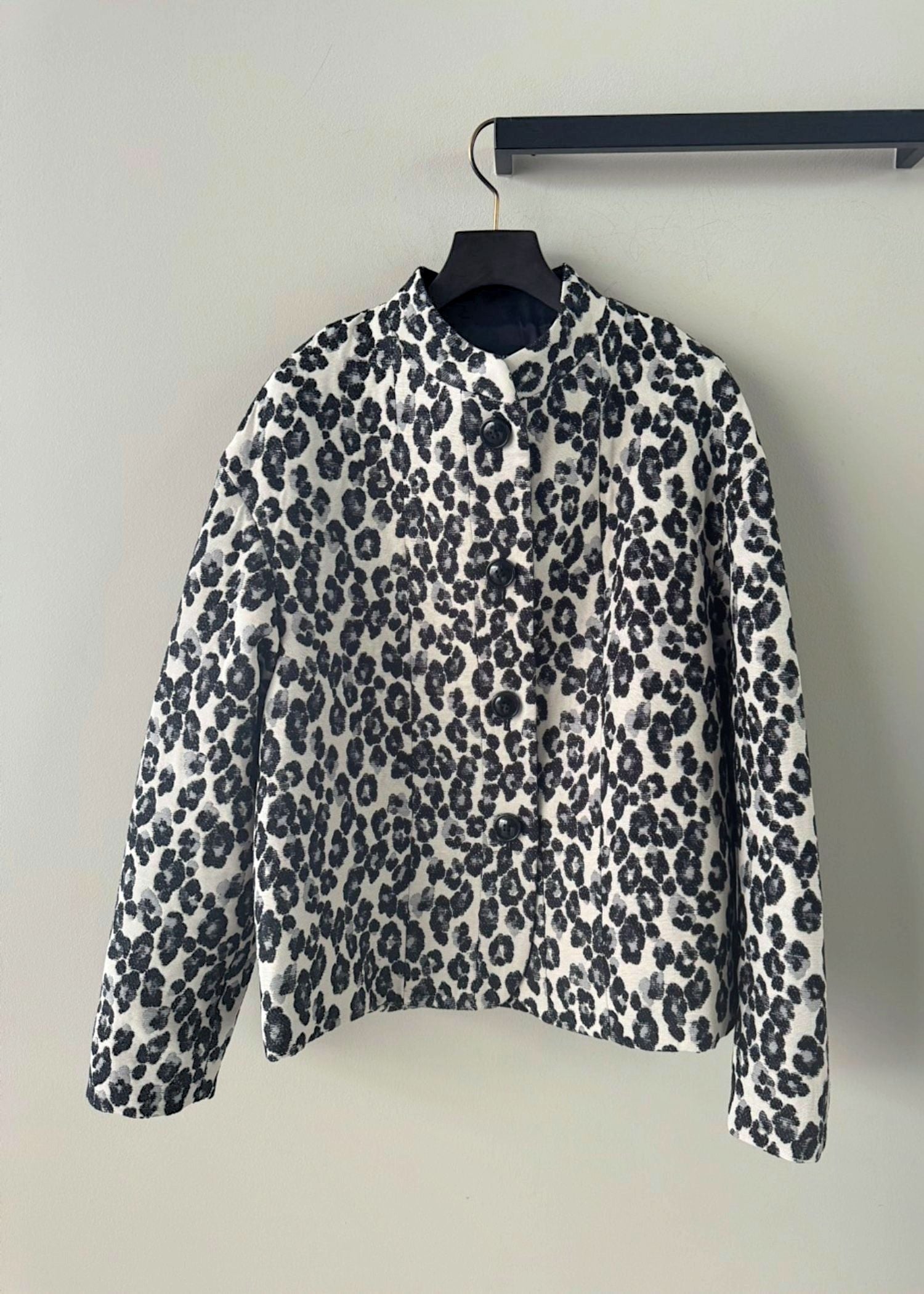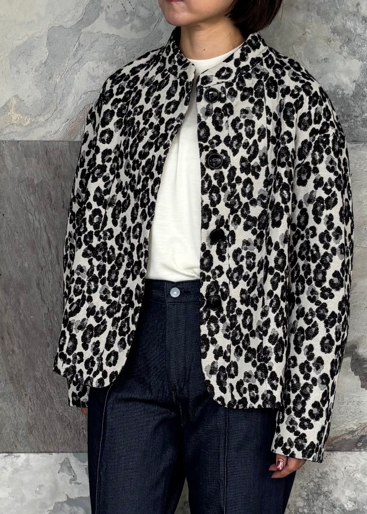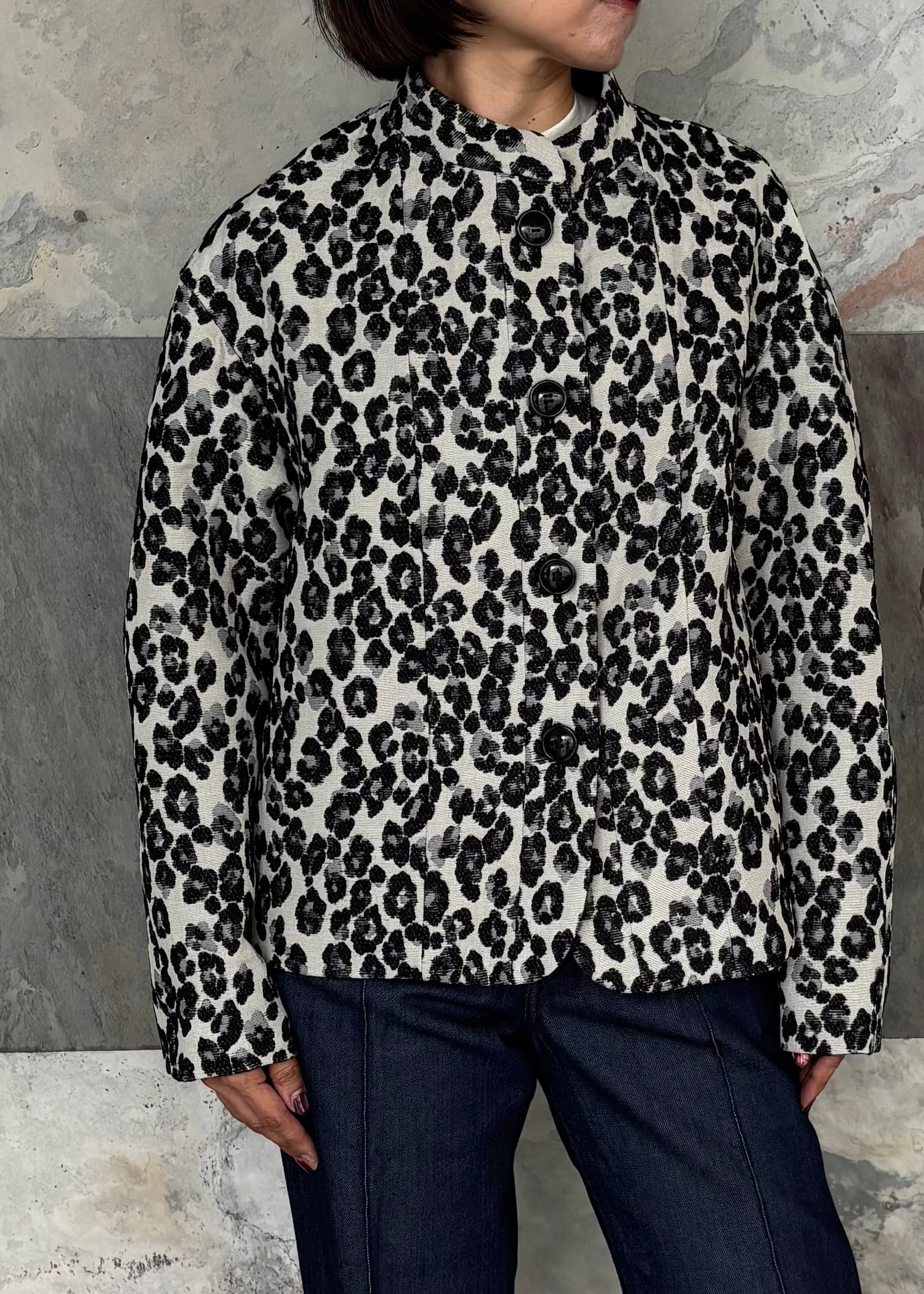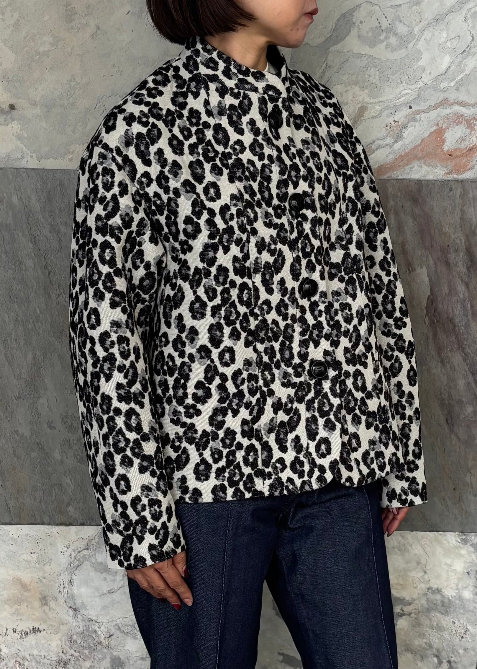 繊細なレオパード柄が印象的なスタンドカラージャケット。