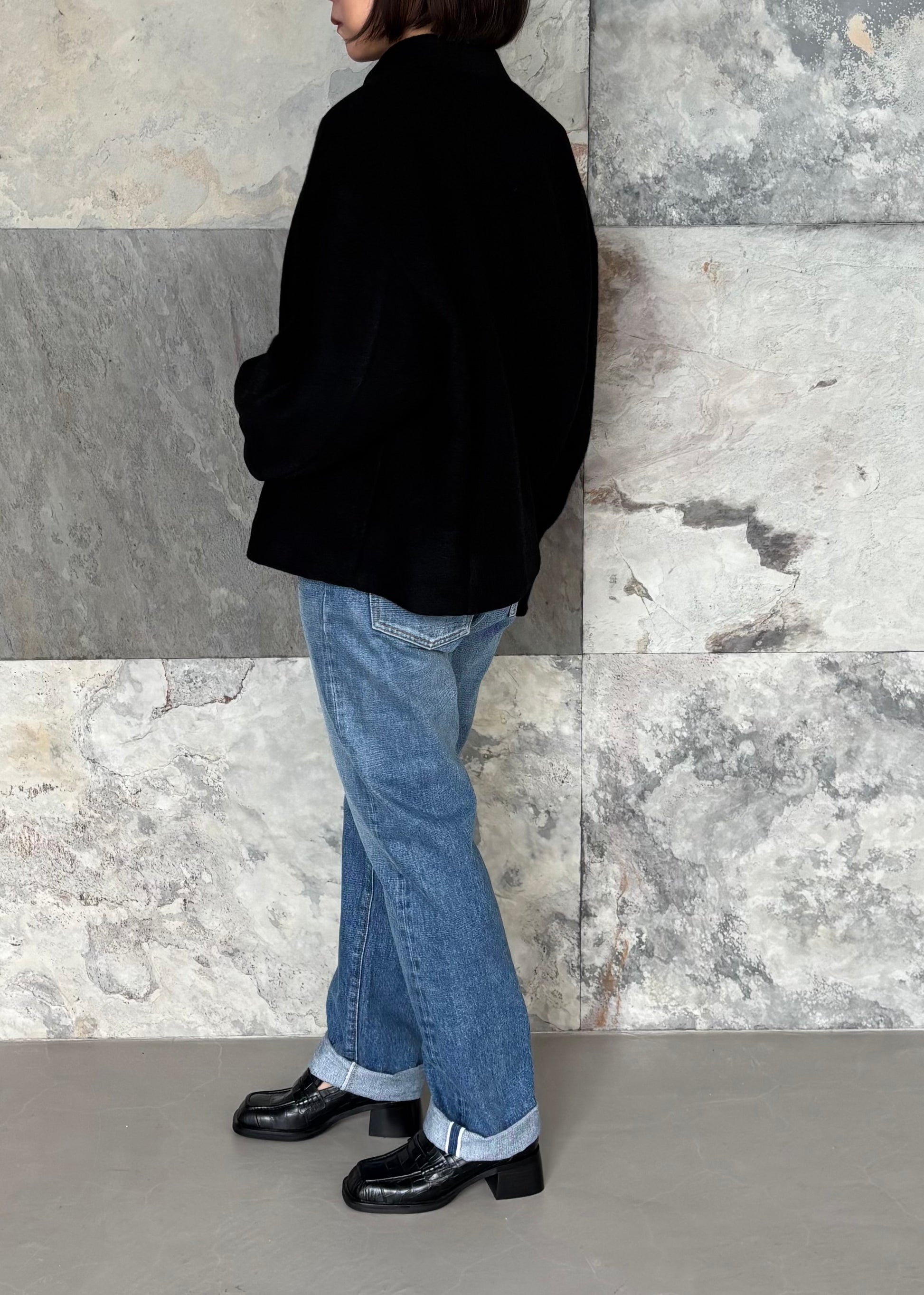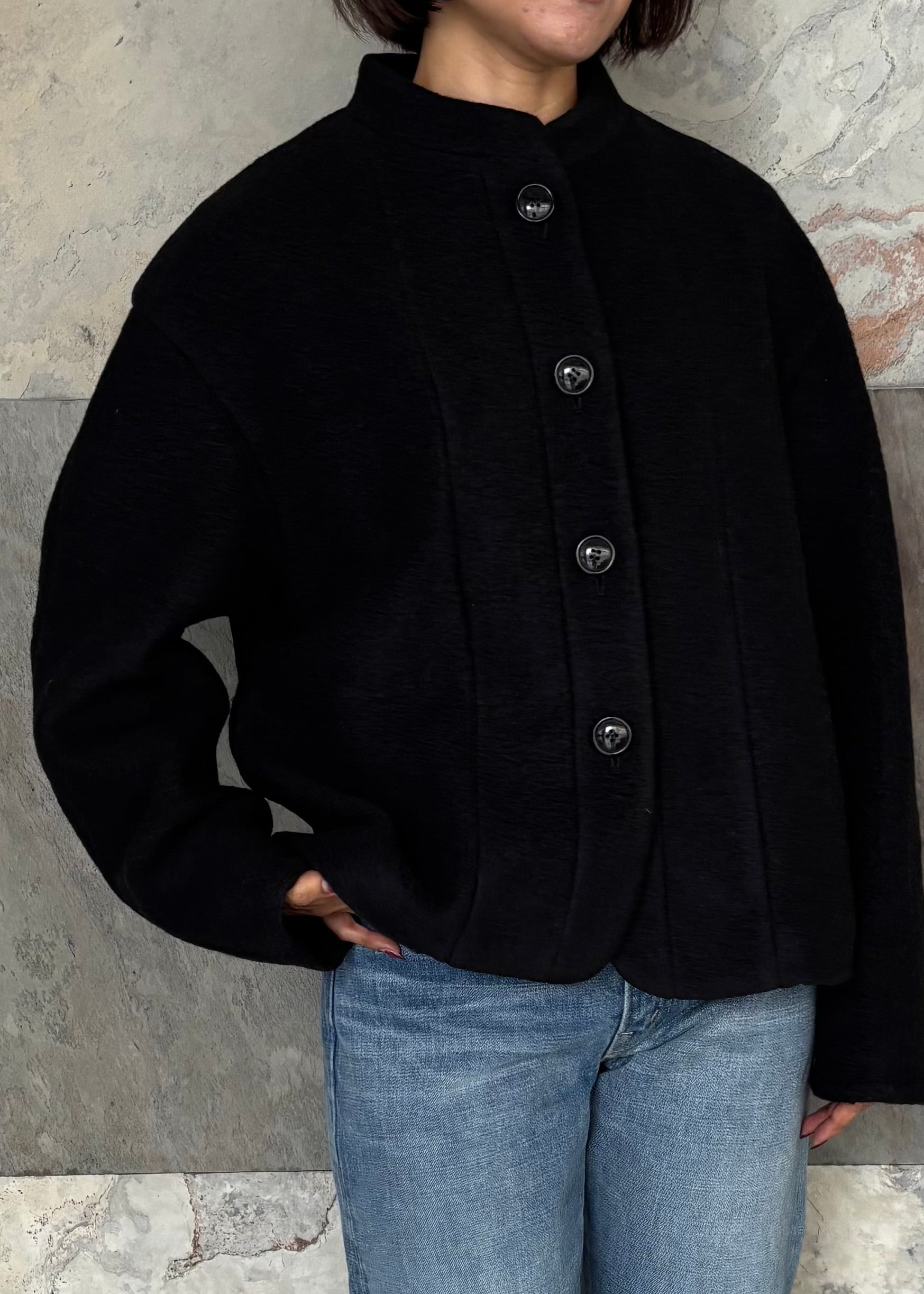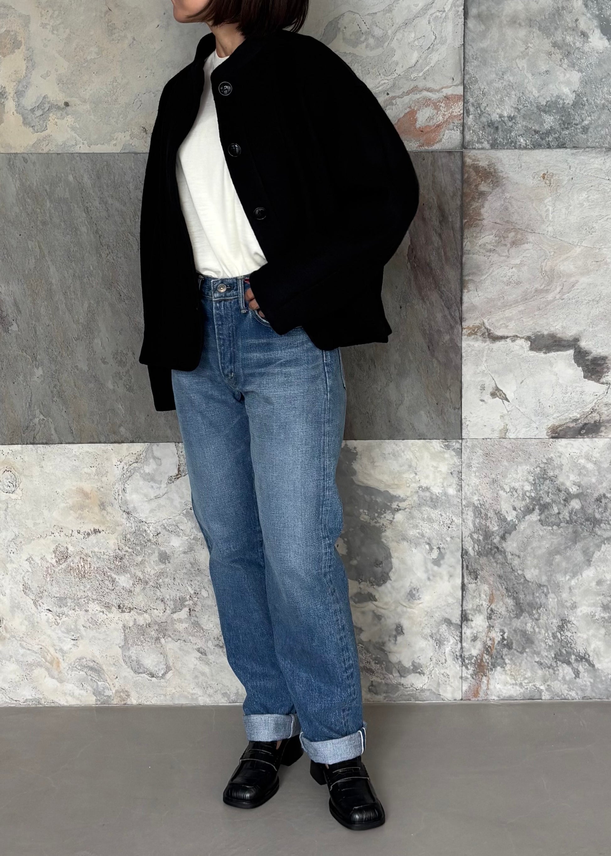 やや短めの丈感でバランスが取りやすく、パンツにもスカートにも好相性。ボタンを留めれば端正に、ラフに羽織れば裏地のレオパードが印象を変え、幅広いシーンで活躍します。