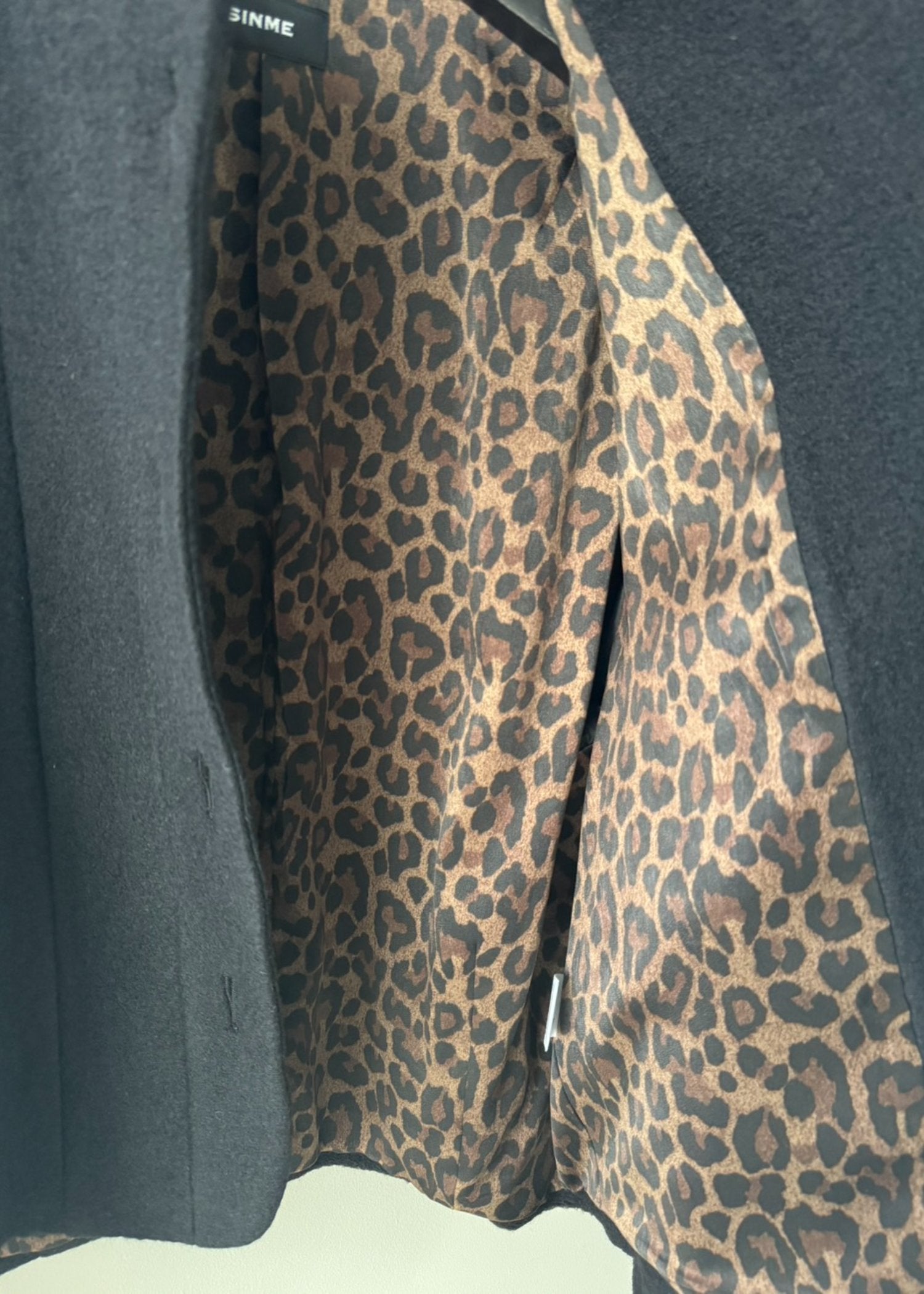 表地はウール70%・ポリエステル30%の混紡で、軽やかさと暖かさを両立。裏地にはなめらかなポリエステル素材を採用し、着心地も快適。ちらりと覗くレオパード柄がスタイリングのアクセントになります。