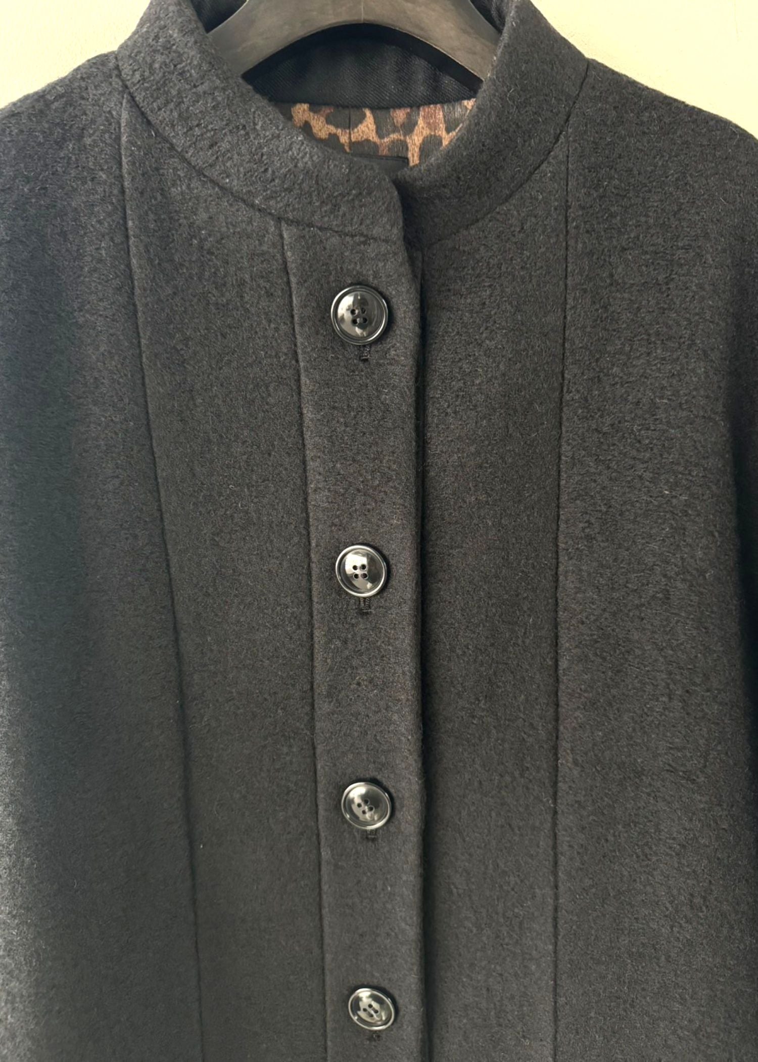 シンプルでシックな表地に、裏地のレオパード柄で遊び心を忍ばせたスタンドカラージャケット。