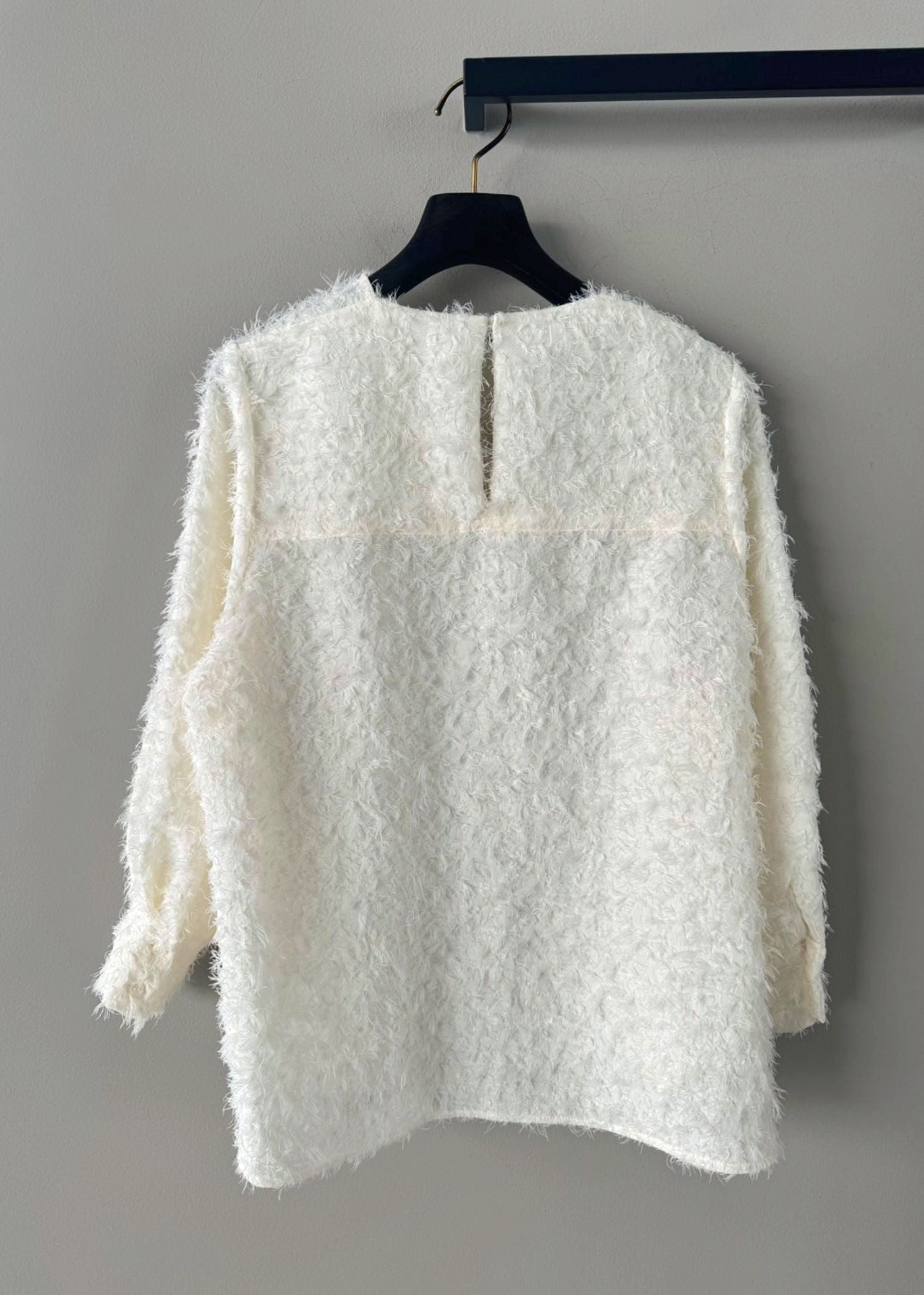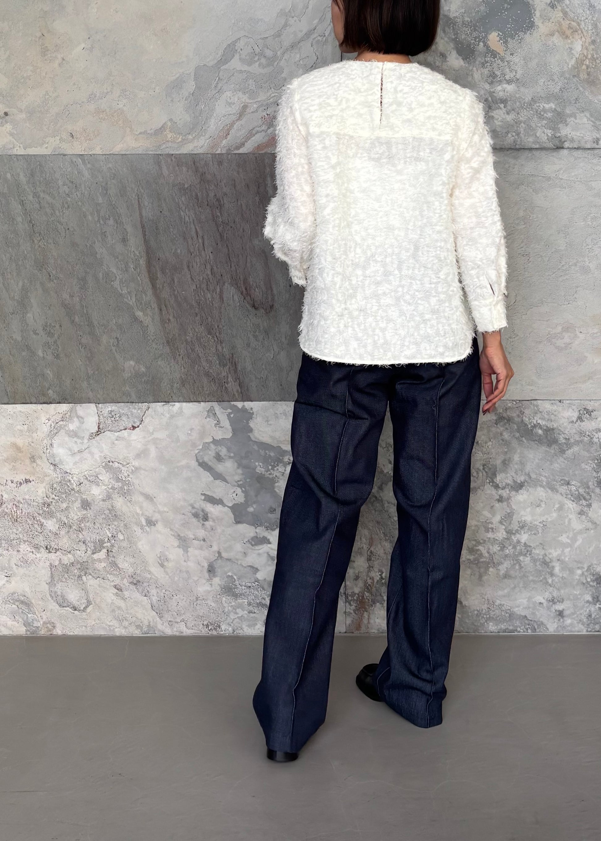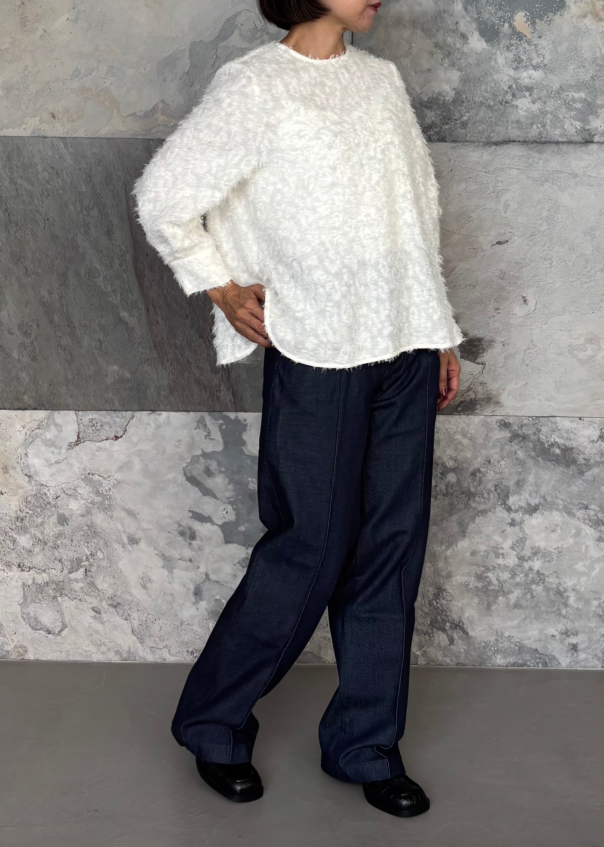 もふもふ感が女性らしいシャギーブラウス。クルーネックの後ろボタンで留めるプルオーバータイプ。やや短めの袖丈はカフス仕様で、エレガントでありながら可愛らしくクローゼットに一着は欲しいアイテム。