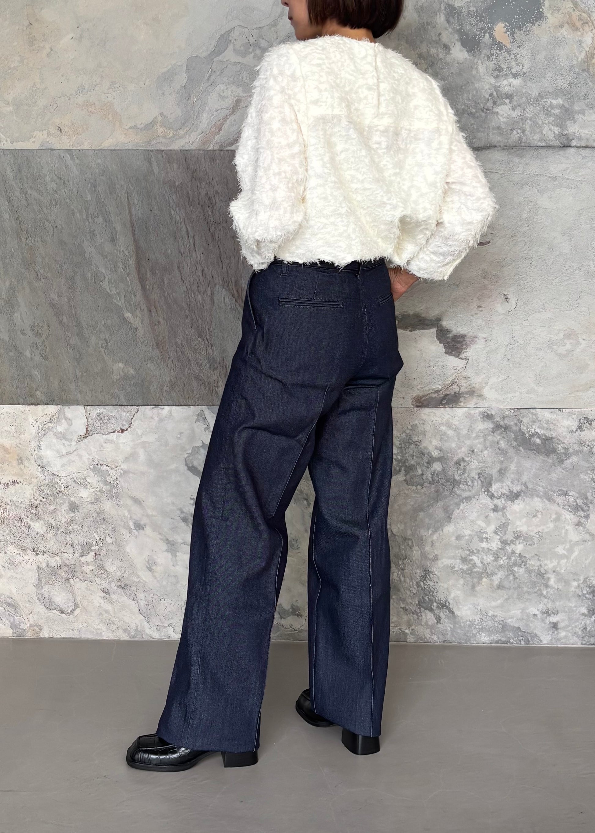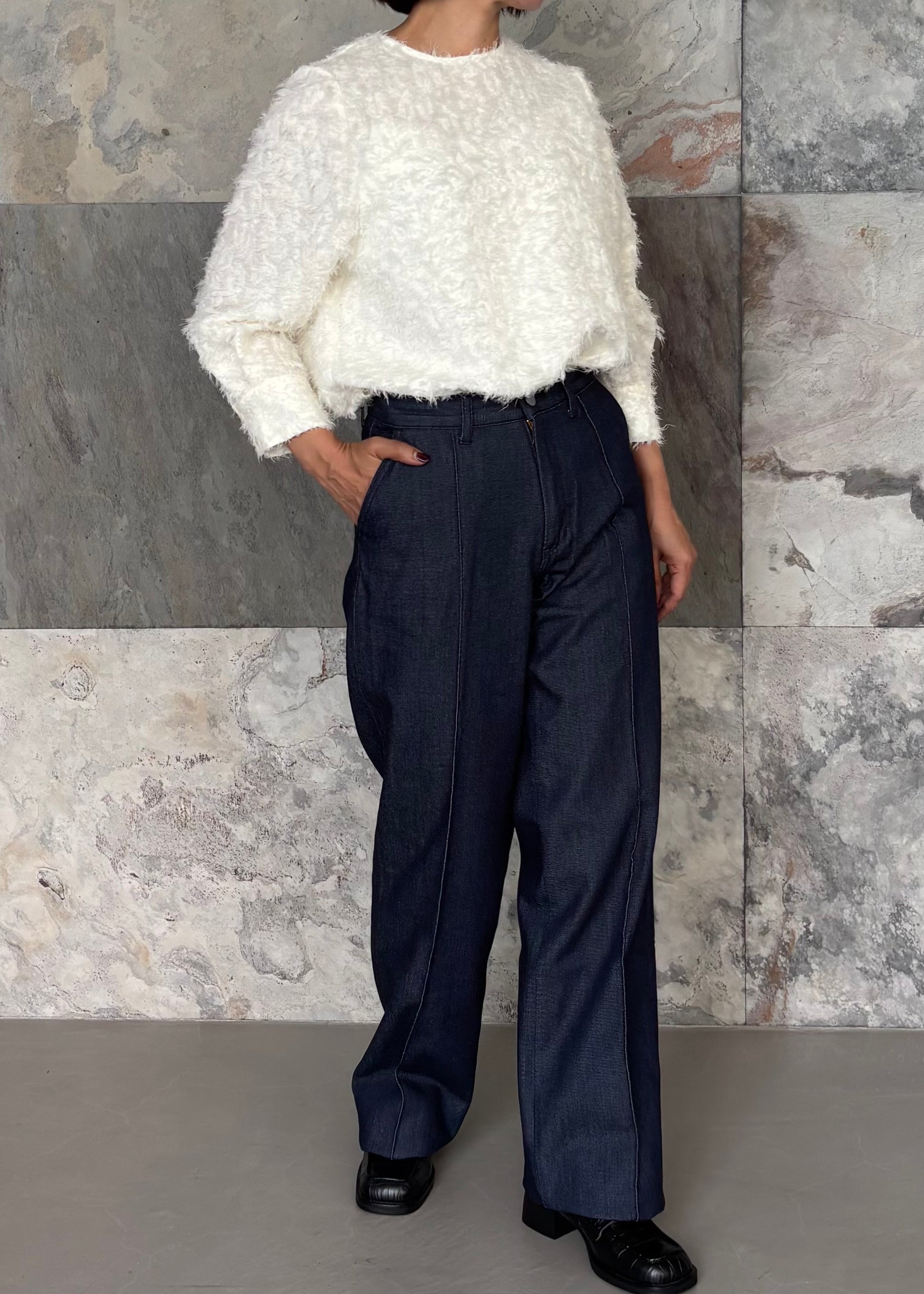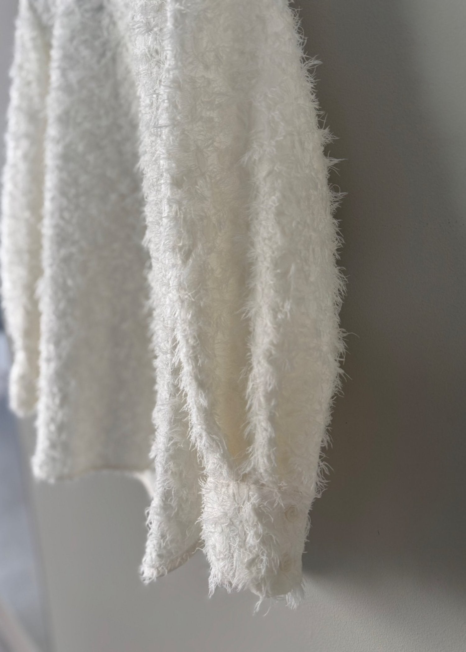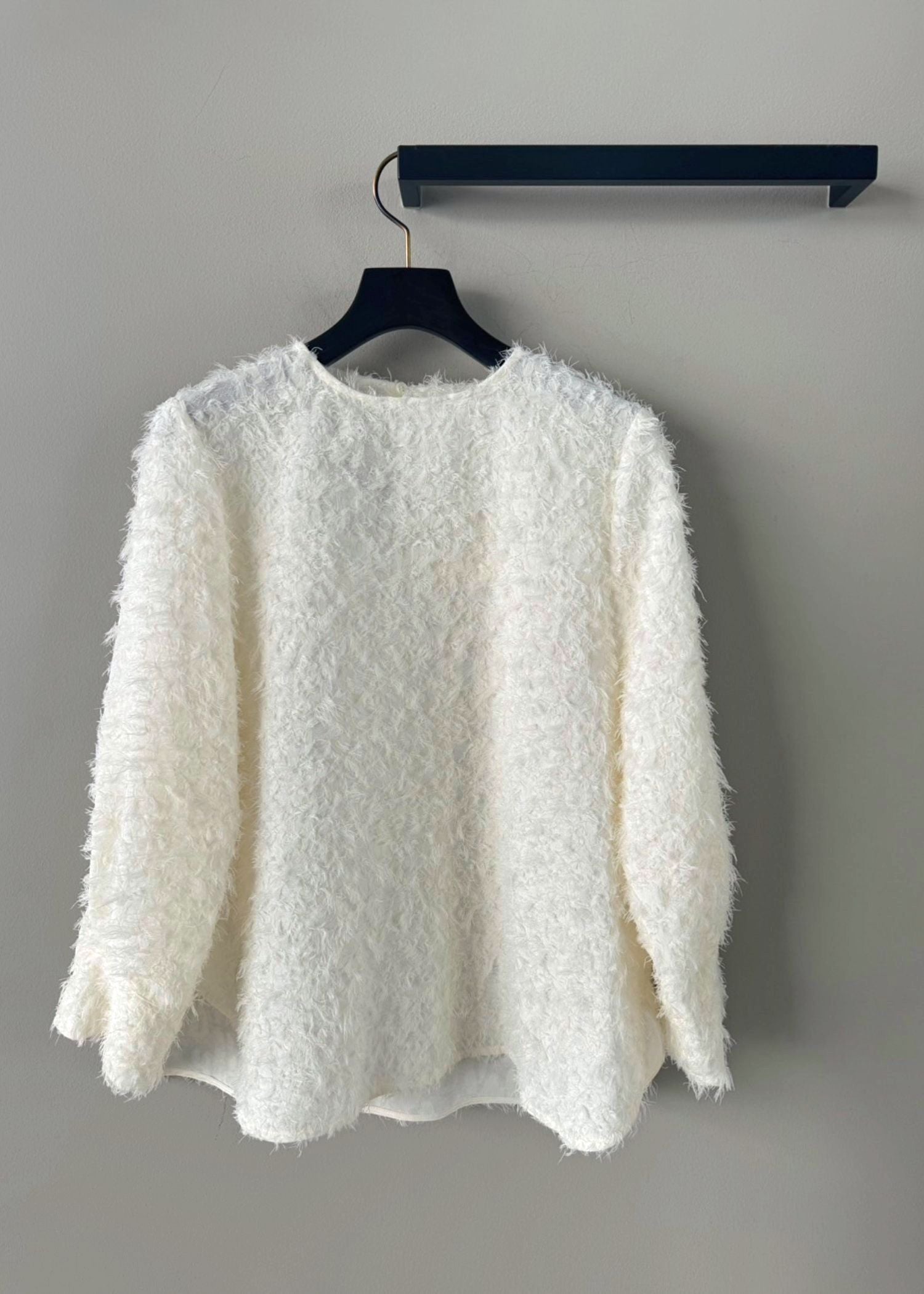 もふもふ感が女性らしいシャギーブラウス。クルーネックの後ろボタンで留めるプルオーバータイプ。やや短めの袖丈はカフス仕様で、エレガントでありながら可愛らしくクローゼットに一着は欲しいアイテム。
