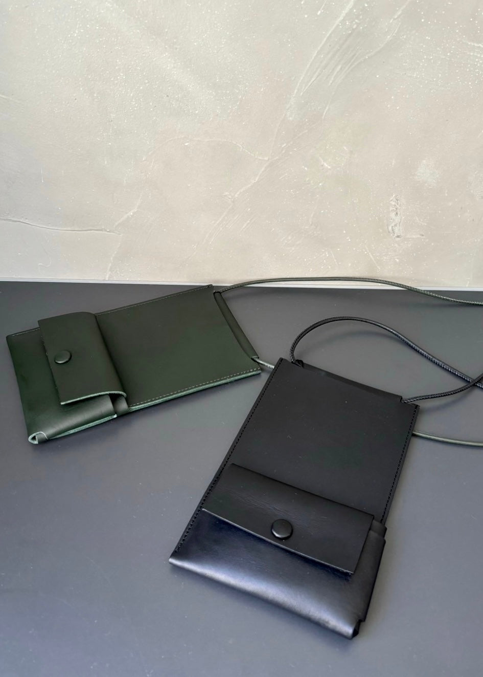 フラットなスマホケースに、財布が組み合わされたショルダー型のポシェット。
